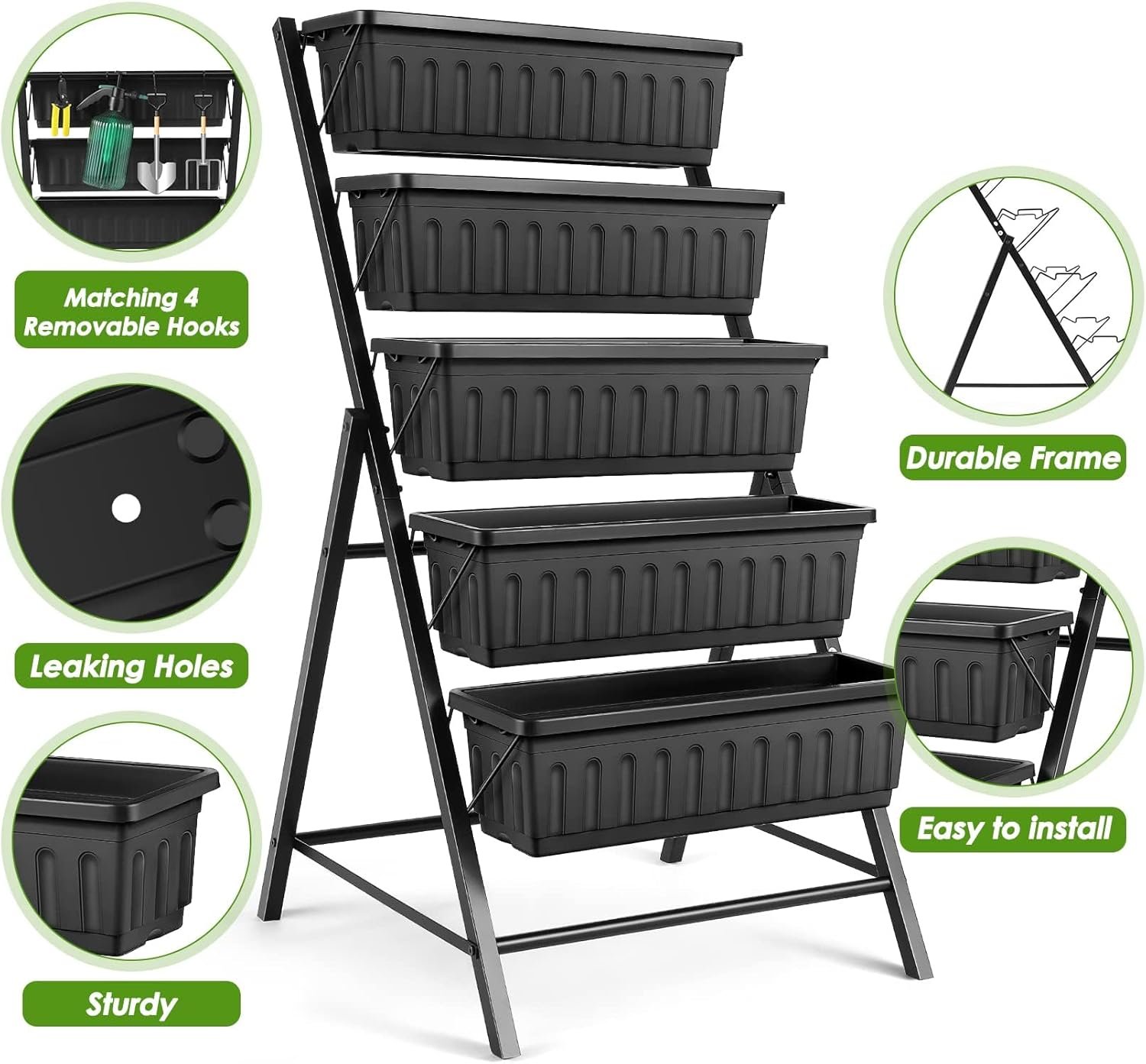 Suyncll Vertical Raised Garden Bed Planter Box,5 Tiers Vertical Garden Planter with Drainage System&4 Hooks (Black No Wheels (22.75″ d X 26″ w X 44.75″ h))