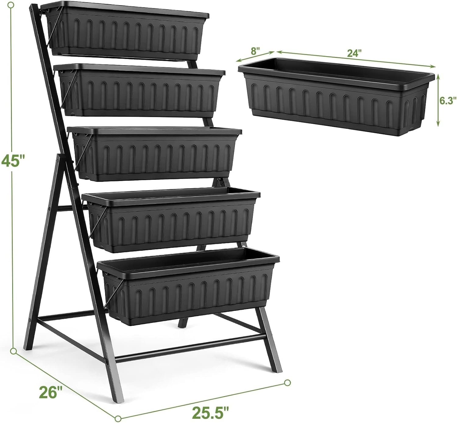 【Vertical planter size freestanding】 25.5” (D) x 26” (W) x 48″ (H) inches. the size of a single planter box is 8.25“D*6.7″W*24″H, and can hold 21lbs per floor.