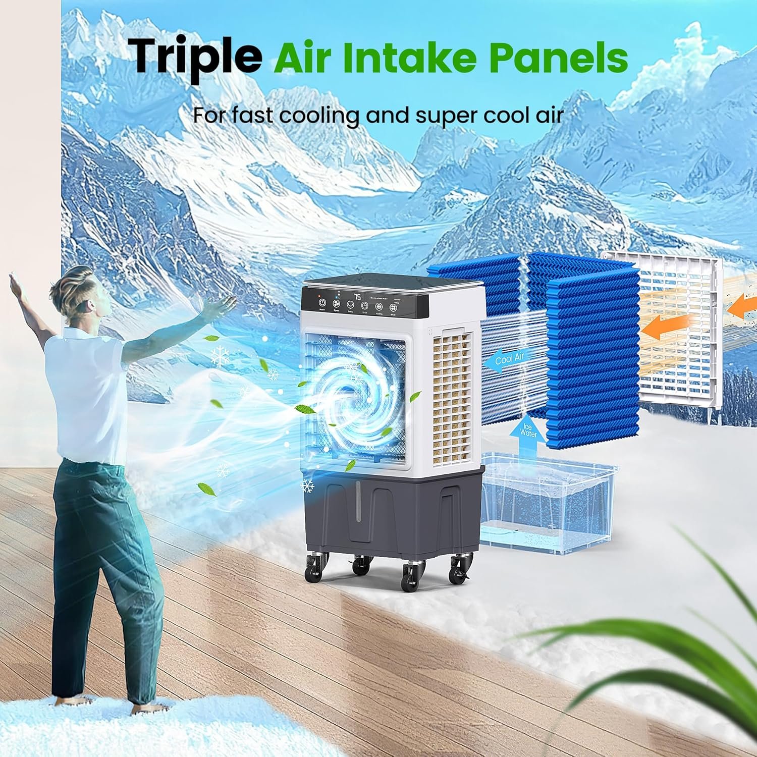 Effortless Operation, Energy-Saving Performance: Enjoy smooth operation with 360° caster wheels, top and bottom water-filling options, and a simple digital control panel. No installation required, no window venting—just plug in and enjoy fresh air instantly. Using only 80W of power, this energy-efficient swamp cooler helps lower electricity usage by up to 70%, making it a smart choice for long, hot days.