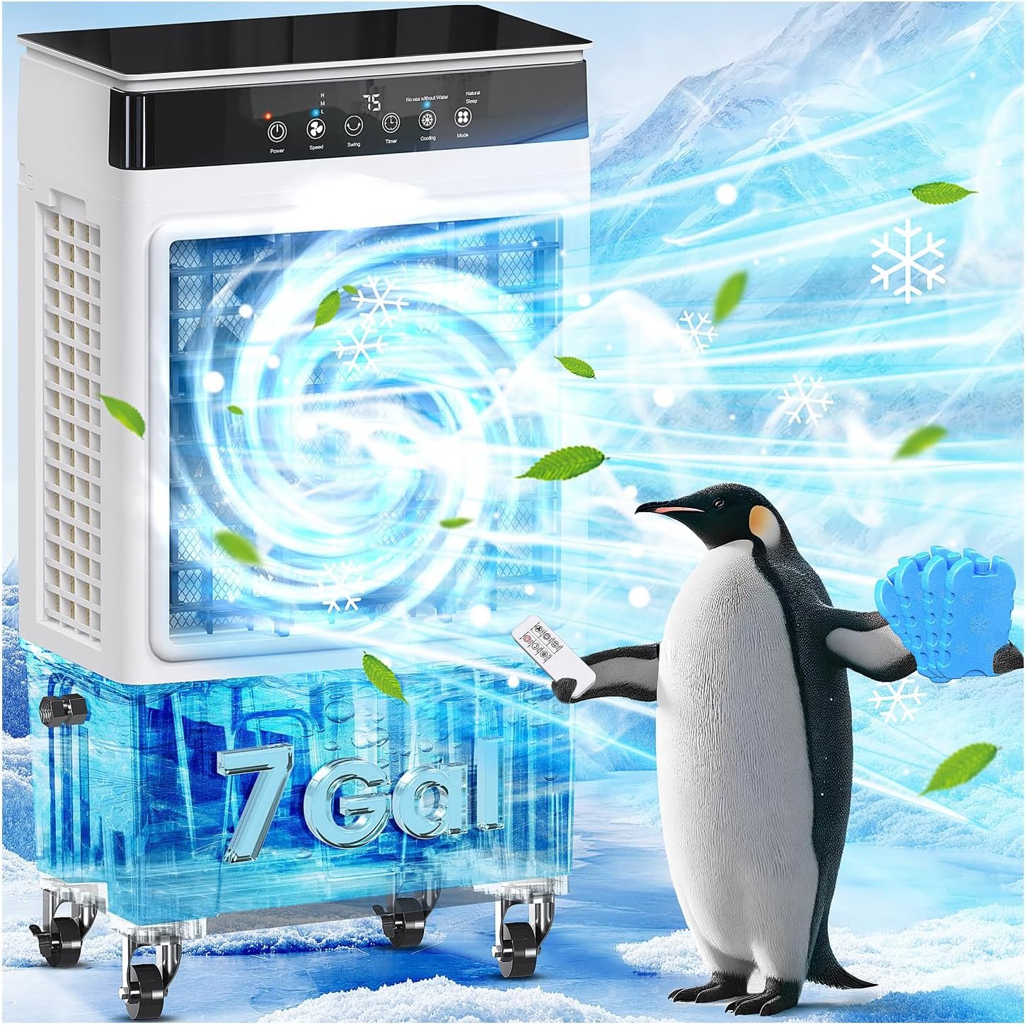 Swamp Cooler Air Conditioner with Dry Burn Protection, 4-in-1 Evaporative Air Cooler with 7-Gal Water Tank, 4 Modes, 3 Speeds, Remote, 12H Timer, Portable Windowless AC for Bedroom Home Office