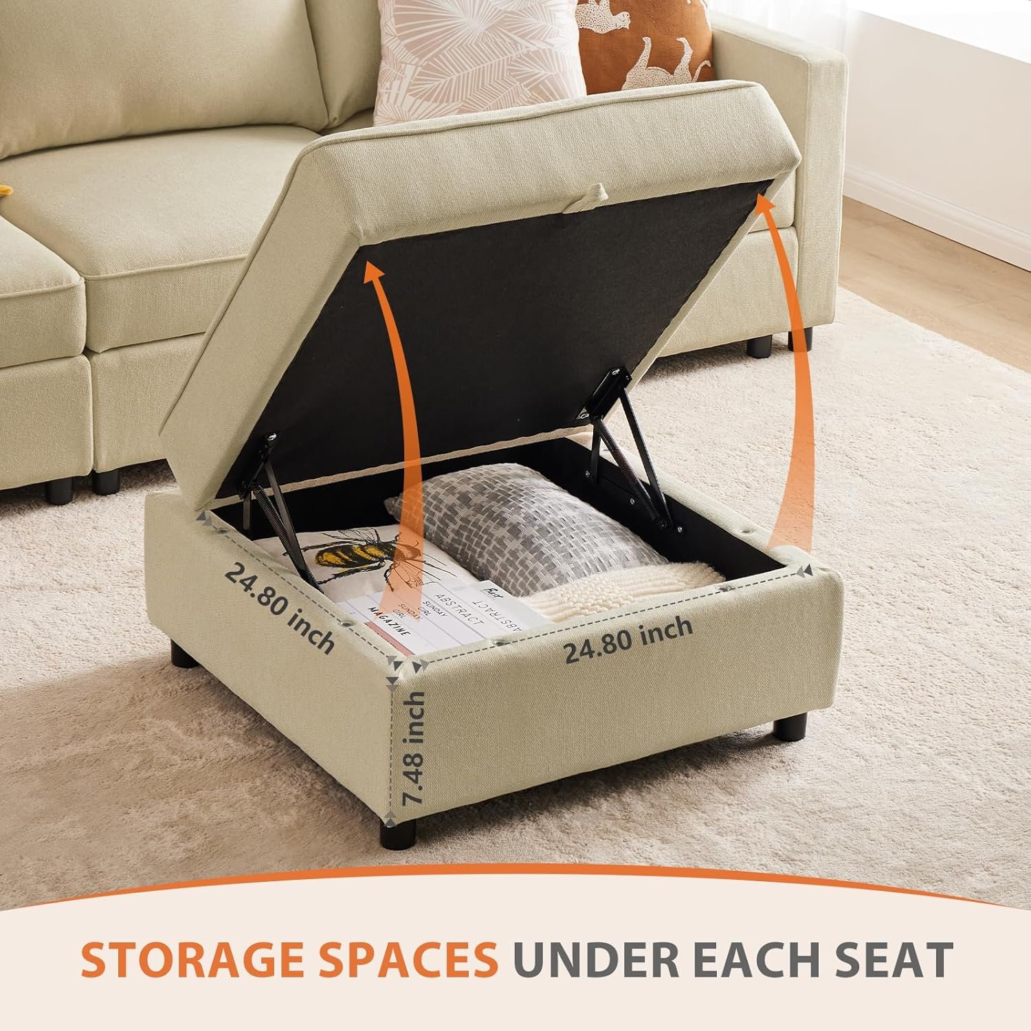 【Ample Storage Space】Storage function under each seat of the living room couch, it is not only a holy place for children’s toys, but also can store blankets and remote control to make the room look neat and clean. Inside the seat is a sofa cushion, remember to take it out before assembly.