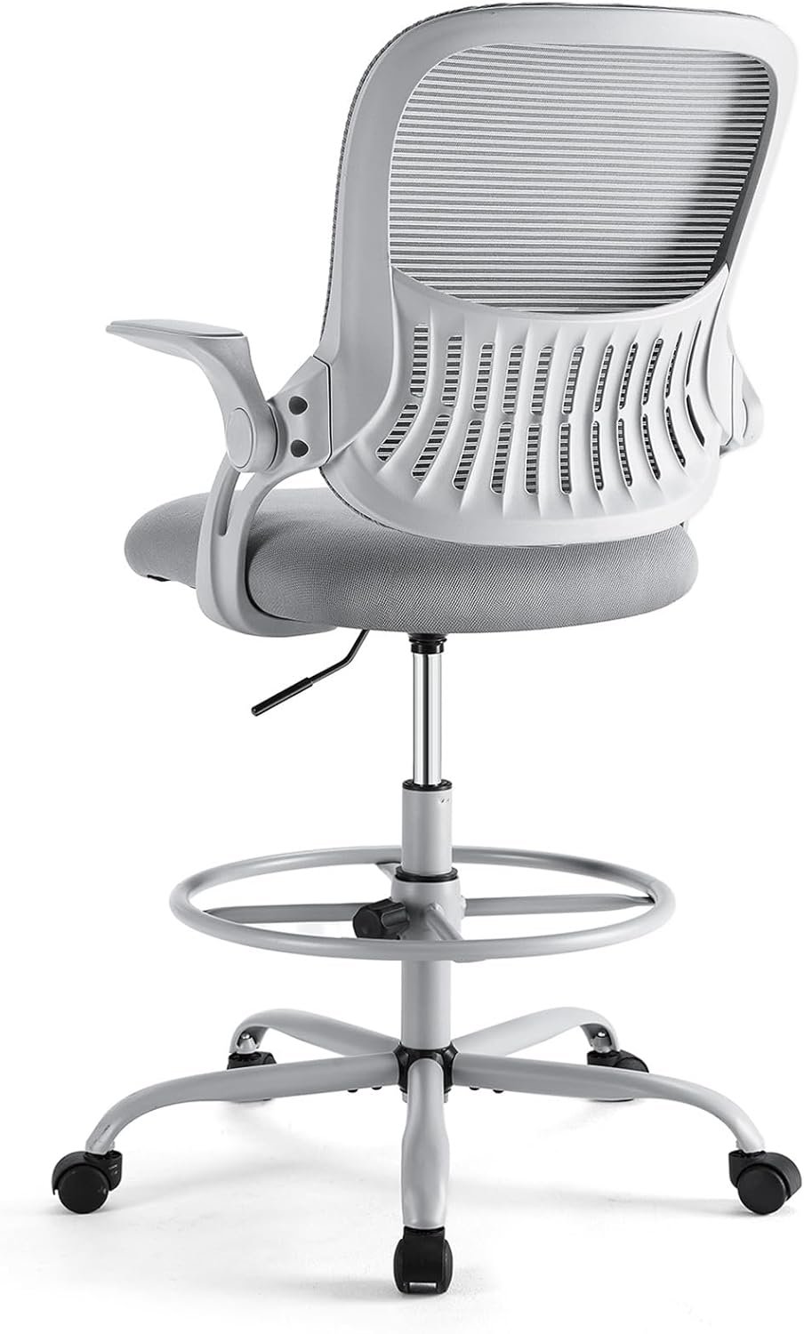 Sweetcrispy Tall Drafting Desk Chair – Ergonomic High Stool Computer with Adjustable Height and Comfy Lumbar Support, Office Rolling Counter with Flip-up Arm and Footrest, Grey