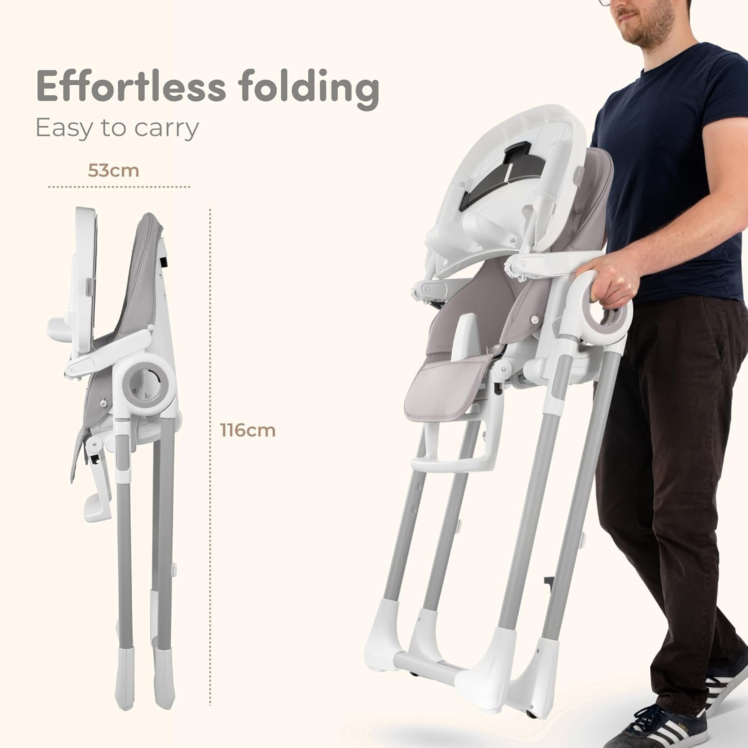SPACE-SAVING HIGHCHAIR THAT WIPES CLEAN – Our highchairs for babies are equipped with a removable, BPA-free plastic tray and a polyurethane high chair cover for quick and easy cleaning. The compact foldable high chair can be folded away in a matter of seconds to save space when not in use.
