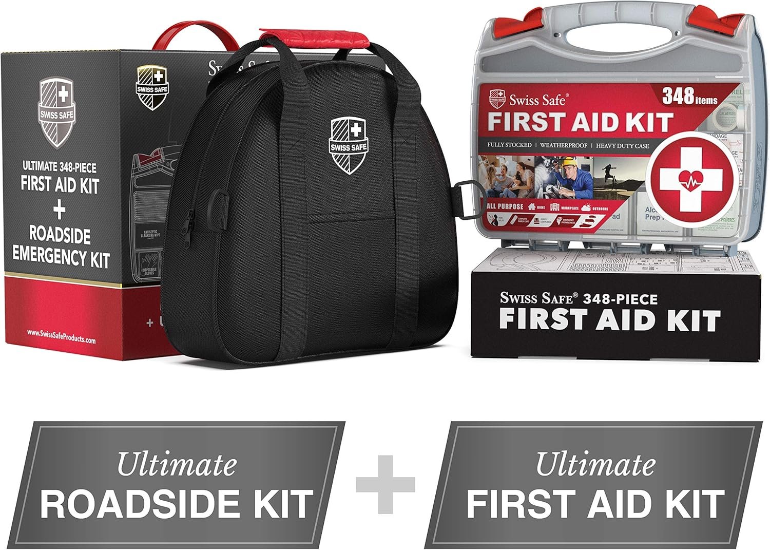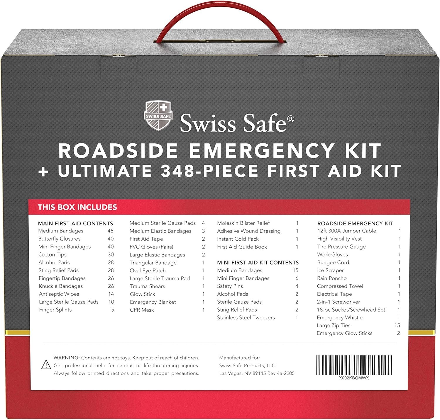 Swiss Safe 2-in-1 Car Emergency Kit | 12-FT Heavy-Duty Jumper Cables & 378-Piece Comprehensive Car First Aid Kit | Compact Roadside Auto Essentials for Vehicle Safety