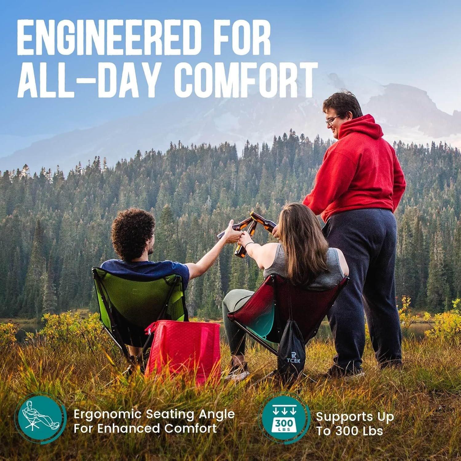Portable, Lightweight, Compact: TCEK’s ultimate portable camping chair weighs just 3.8 lbs and measures 14.2” x 3.9” x 3.9”. Easily carry it anywhere with the included bag. Perfect for outdoor adventures, ensuring comfort for all