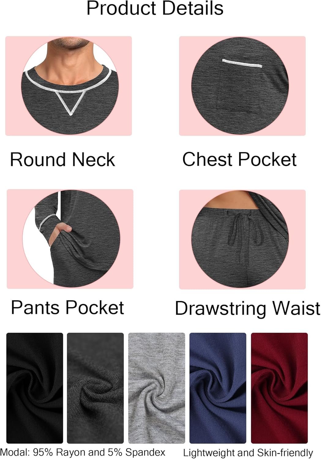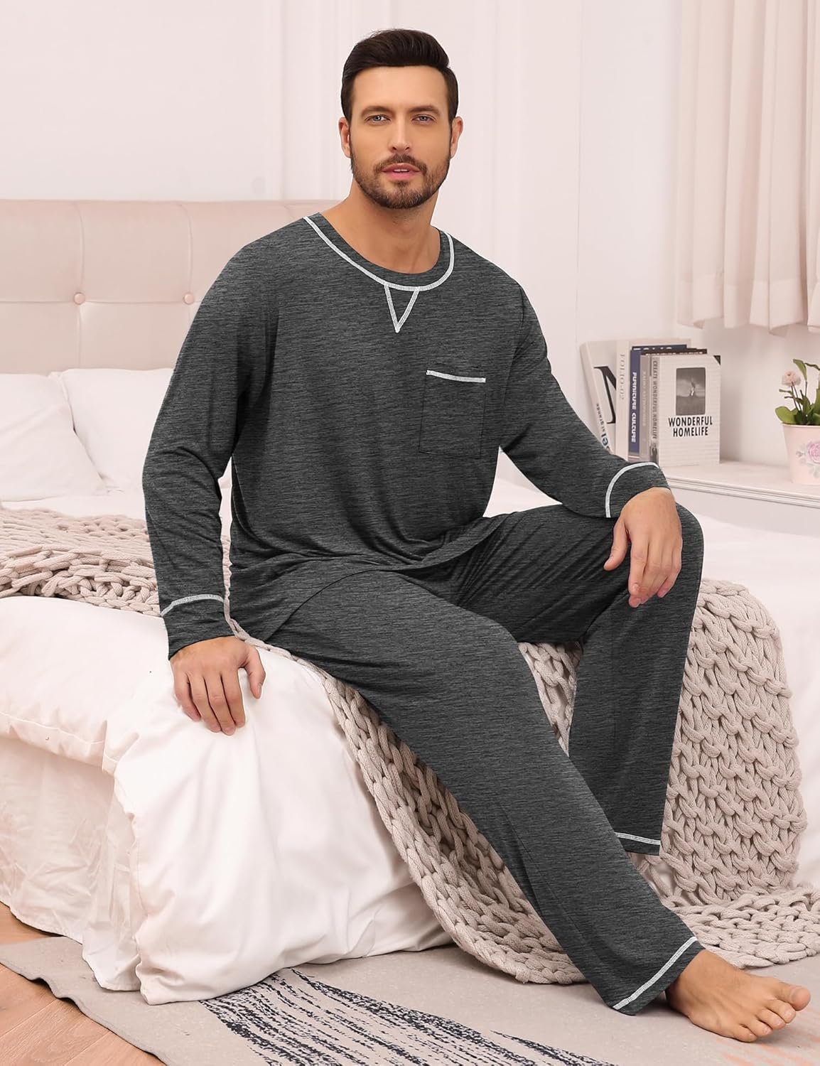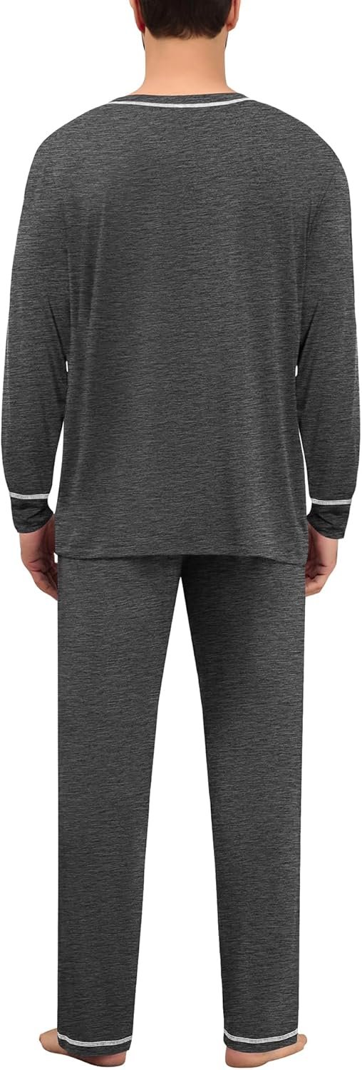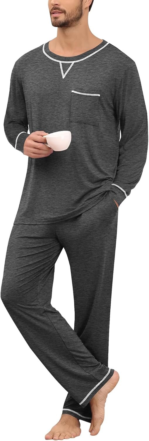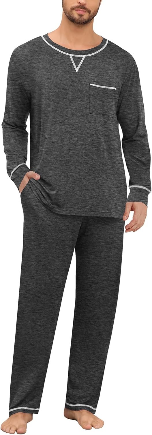 SWOMOG Mens Pajamas Set Modal Long Sleeve Sleepwear Crew Neck Pjs 2 Piece Loungewear Nightshirt Top & Pants with Pockets