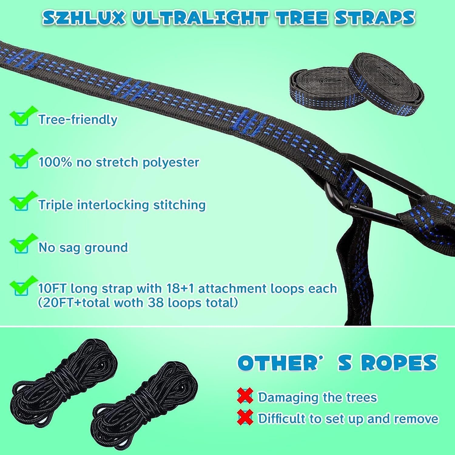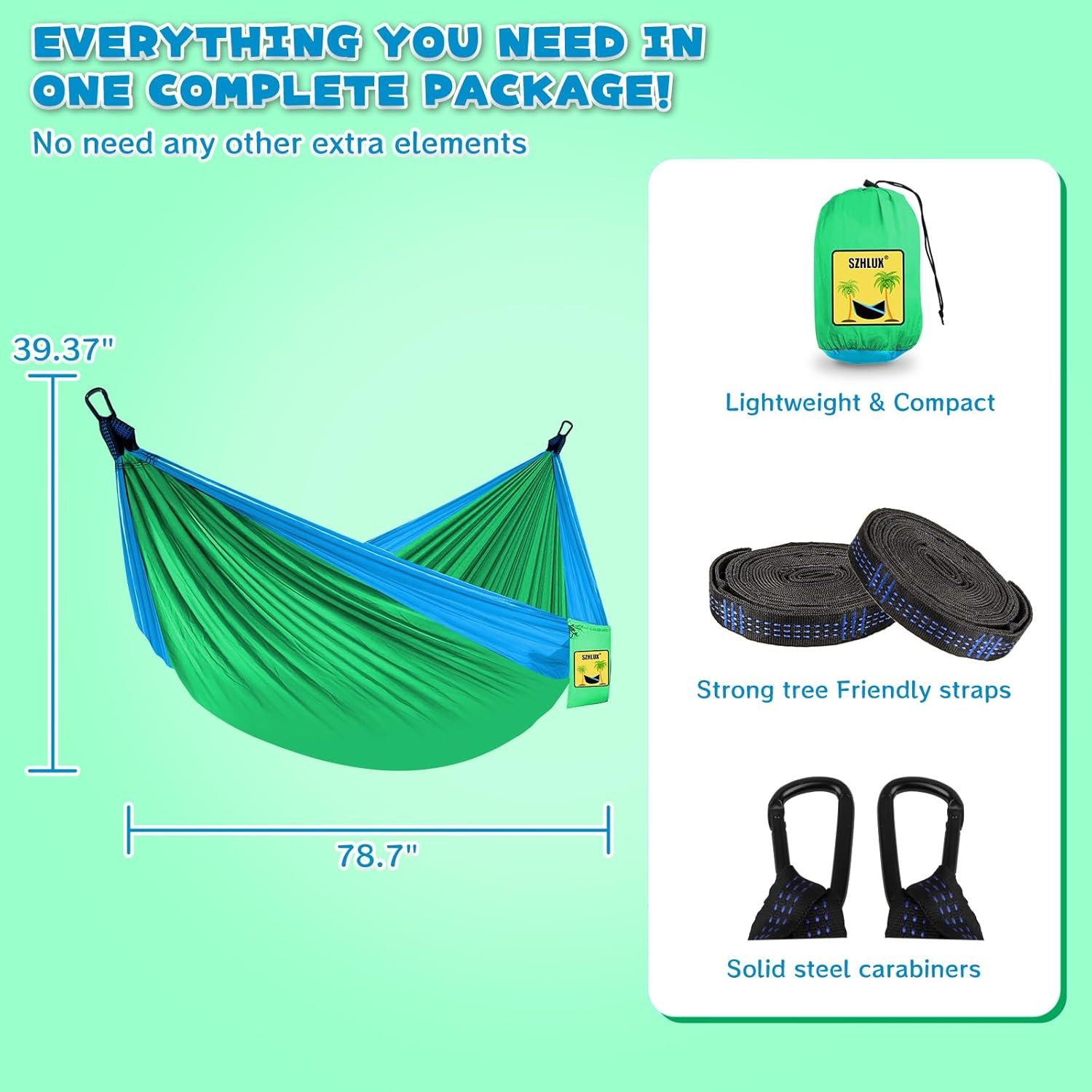 Premium Quality: Built to last for as long as you need it, the SZHLUX hammock is crafted with strong yet soft 210T parachute nylon and triple interlocking stitching.