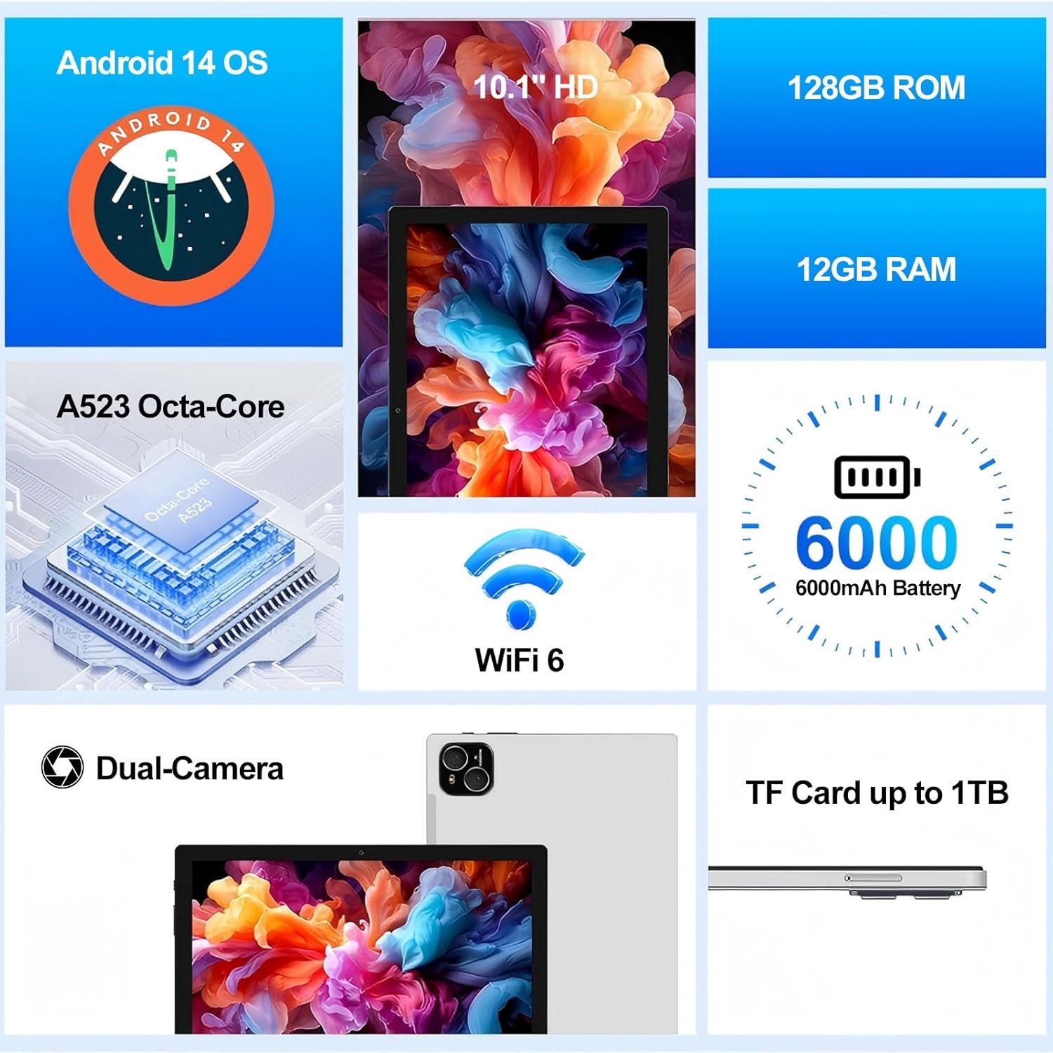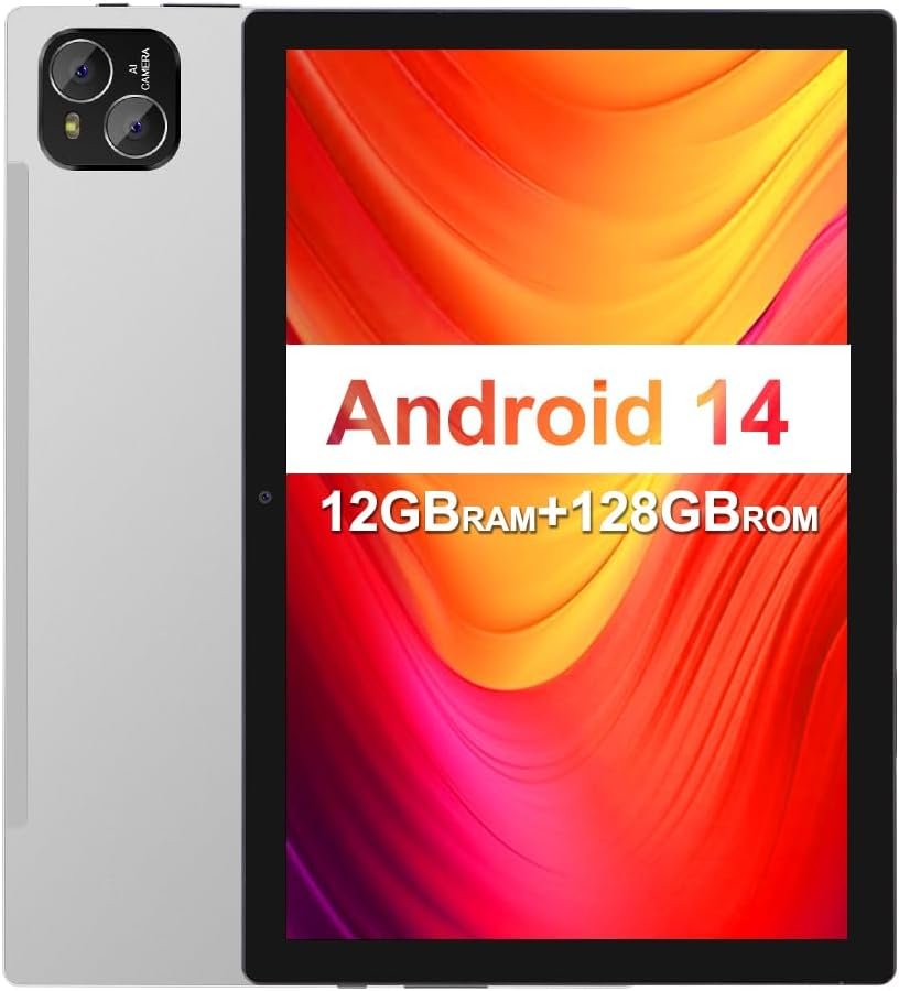 Tablet, 10 inch Android 14 Tablet, Octa-Core Processor, 12GB RAM + 128GB ROM, 1280×800 HD IPS Touchscreen, 6000mAh Battery, 2.4G/5G WiFi 6, BT 5.4, Dual Camera, Metal Body, Sliver