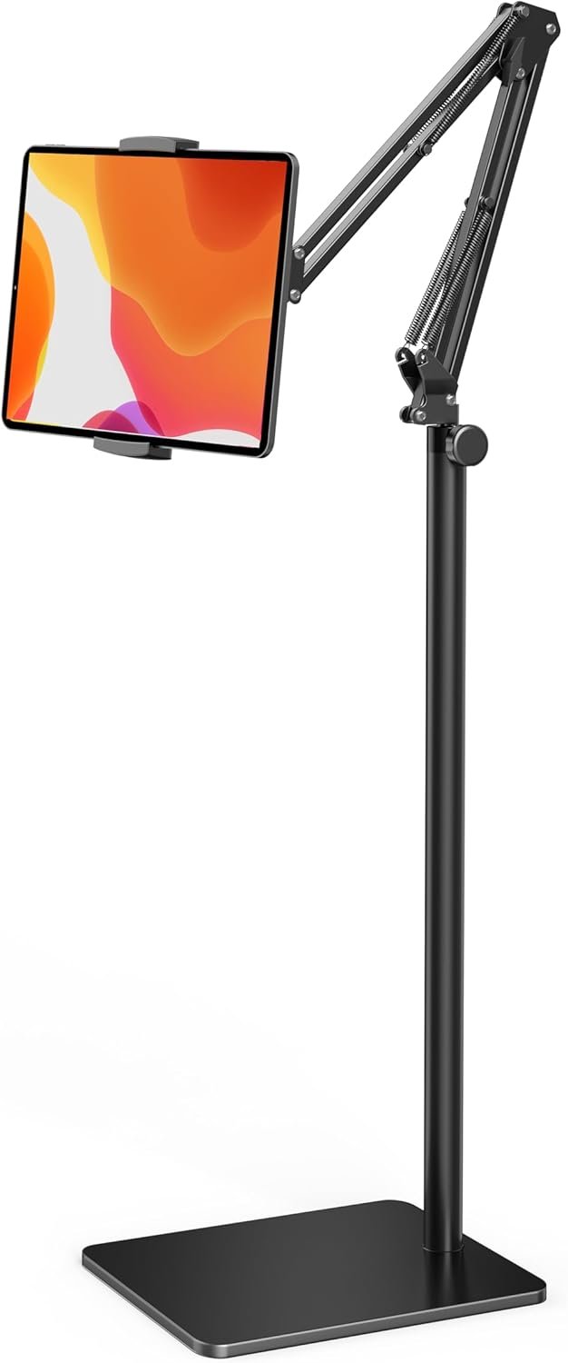 Tablet Stand For Bed:The phone stand can be easily adjusted from 13.4 inches to 58.7 inches off the ground, the stand can be rotated 360 degrees to change any viewing angle, the total length of the cantilever arm is 22in(meet your needs in every aspect).4.2LB reinforced base provides higher stability.