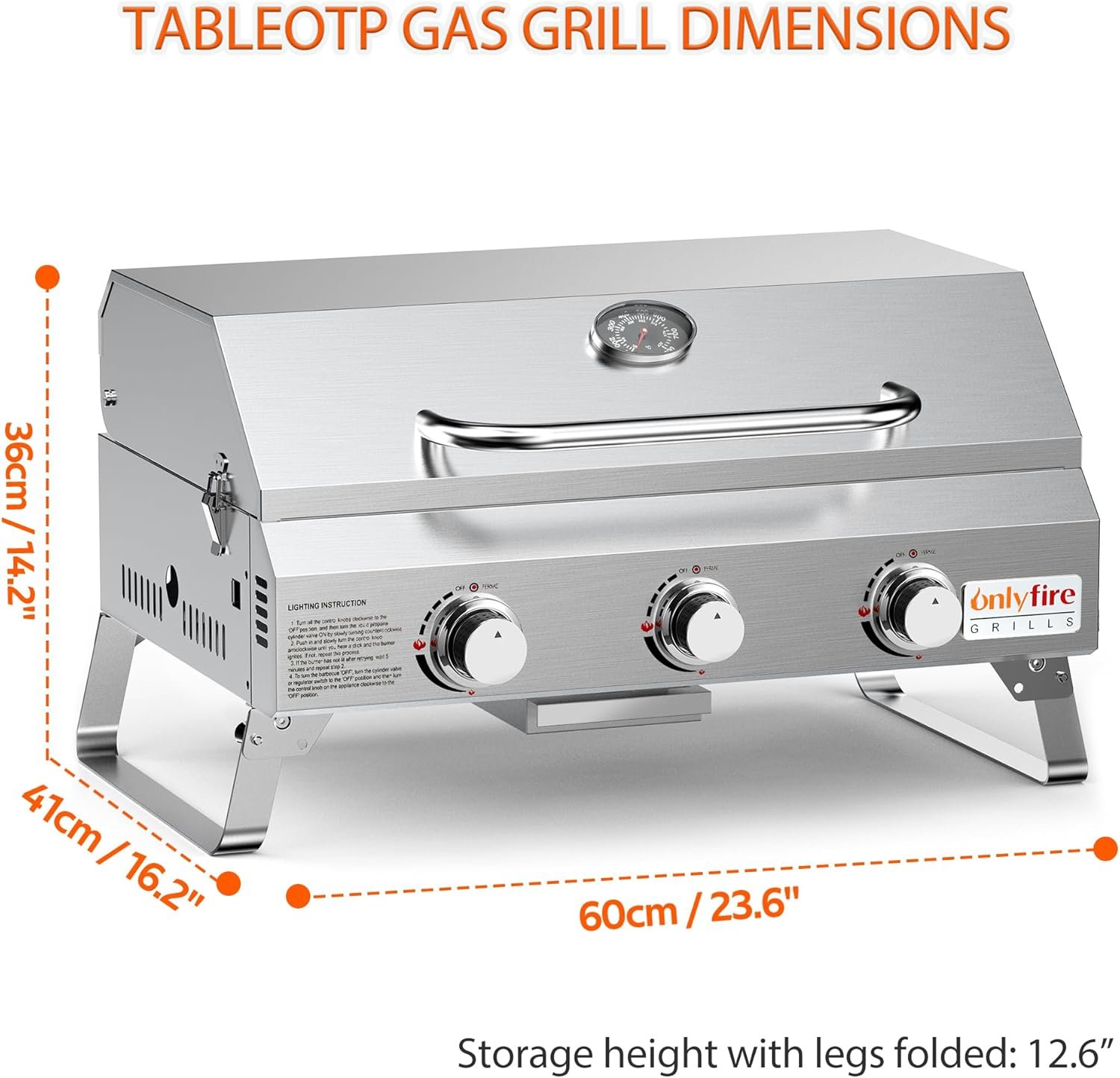 PORTABLE WITH FOLDABLE LEGS: The heavy duty portable propane grill measures 16.2″D x 23.6″W x 14.2″H, and folded height 12″ while legs are folded. This grill is designed with foldable legs which allow you to transport and store easily. The locking cover, folding legs, and carrying handle make it secured and safe for on-the-go grilling.