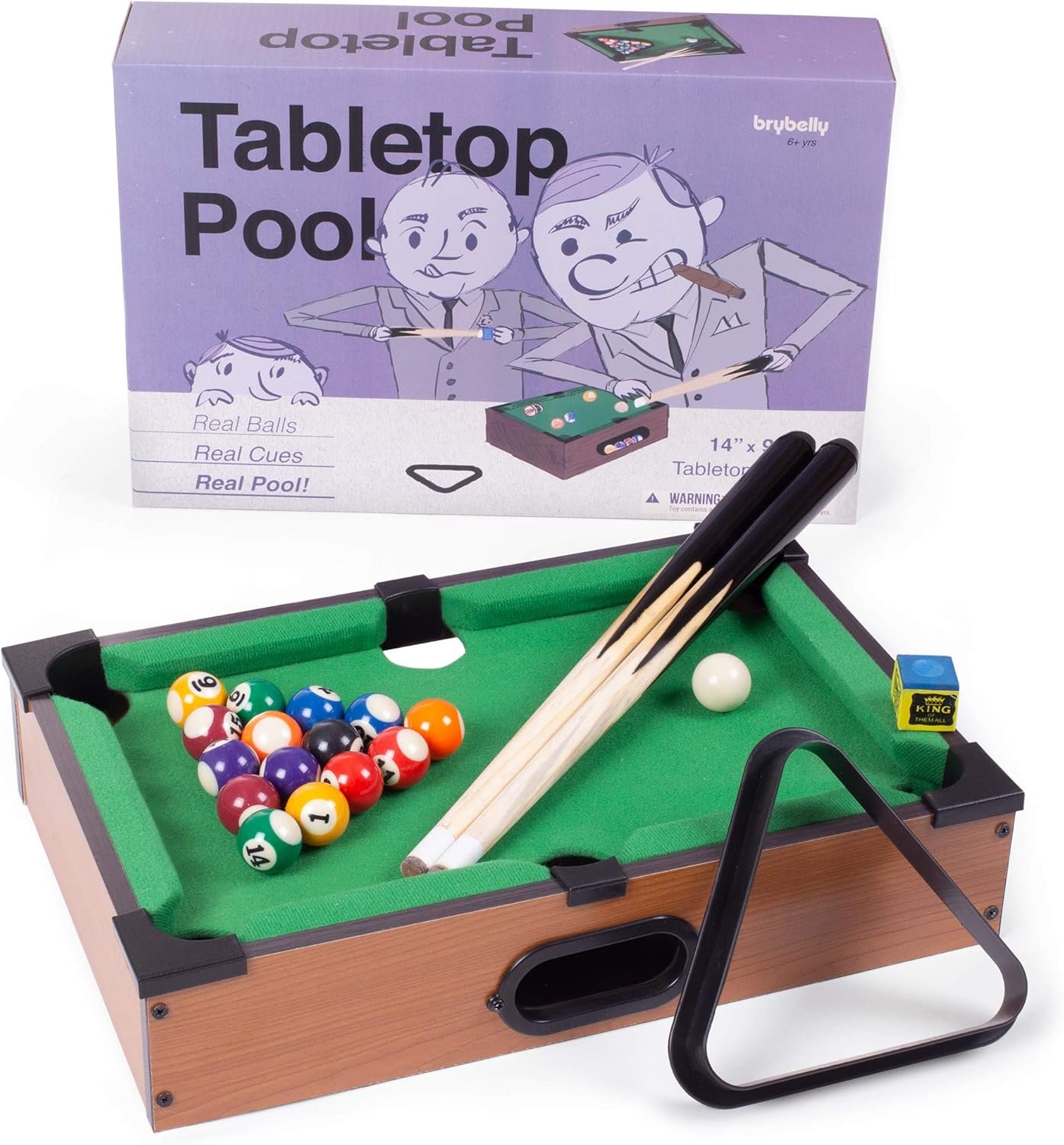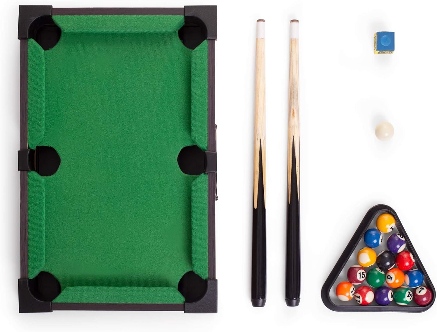 Low on space, short on time? Play pool anywhere you go! This tabletop set includes everything the big tables have; 16 solid resin billiard balls, two real wood pool cues, a triangle rack for tight racks, even a cube of chalk for extra ball control. Comes with one miniaturized version of a pool table with felt tablecloth lining so you can play pool right at your desk! No trips to the break room or attempts at begging your boss for a pool table needed.