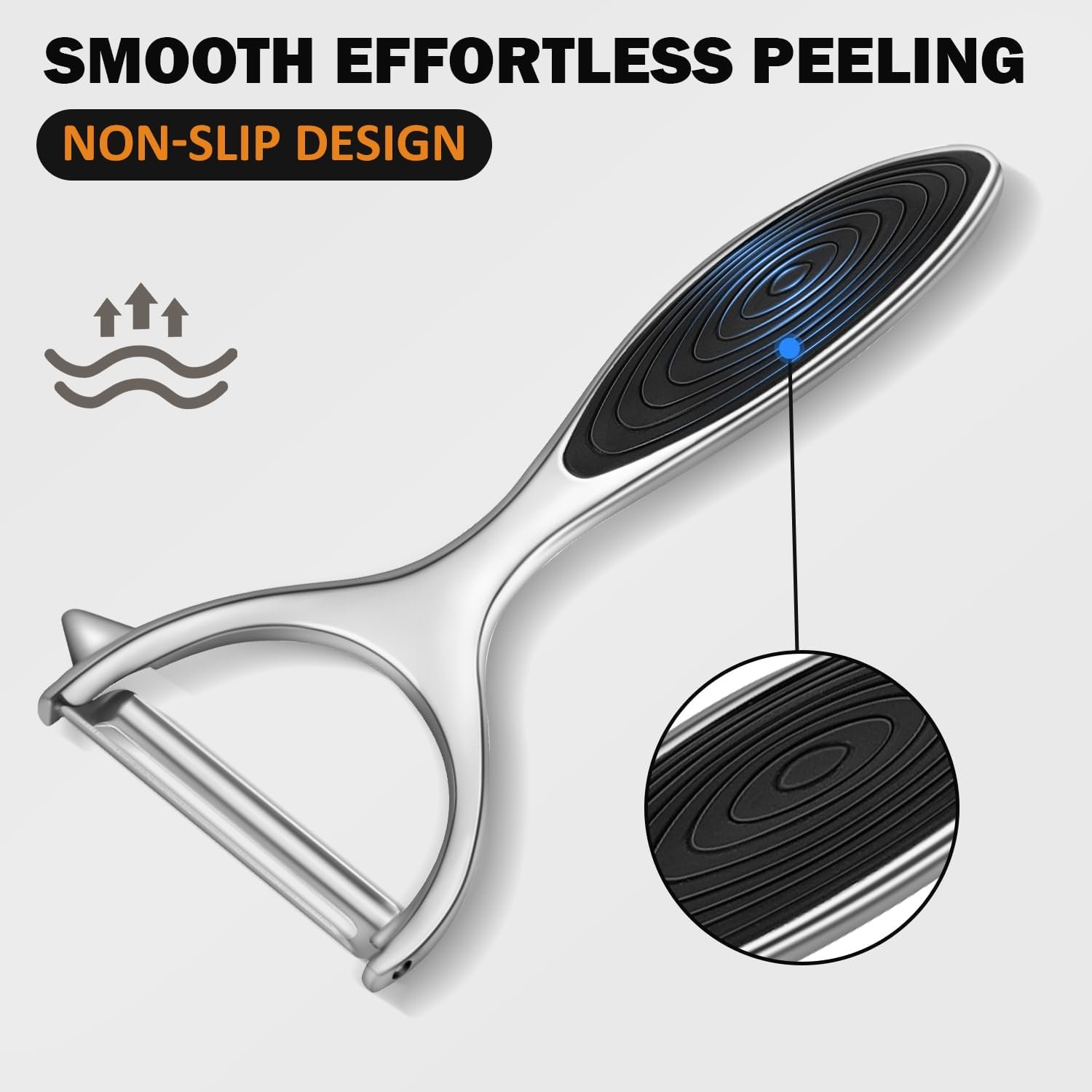 Ergonomic Design and Non-slip: The rubber part will make the handle non-slip. Streamlined design allows for a smooth peeling process. Y-shape blade holder can stably control the peeler so that the blade is evenly stressed and the skin is removed smoothly.