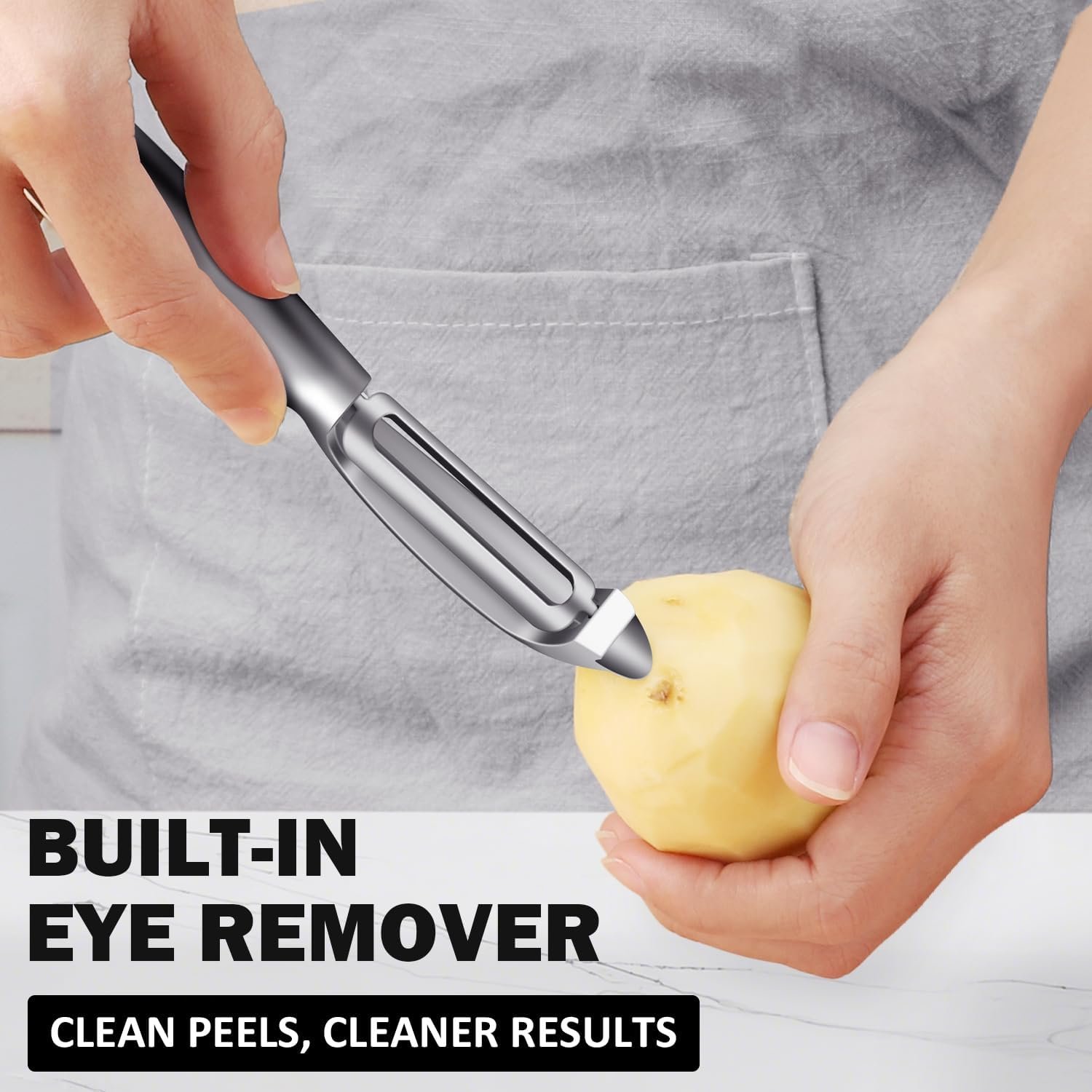 Upgrade Quality Material: Use upgraded rust free carbon steel blade and zinc alloy body makes it rust-free. The blade is hard which better than ordinary stainless steel. Quickly removes tough skinned fruits and vegetables.