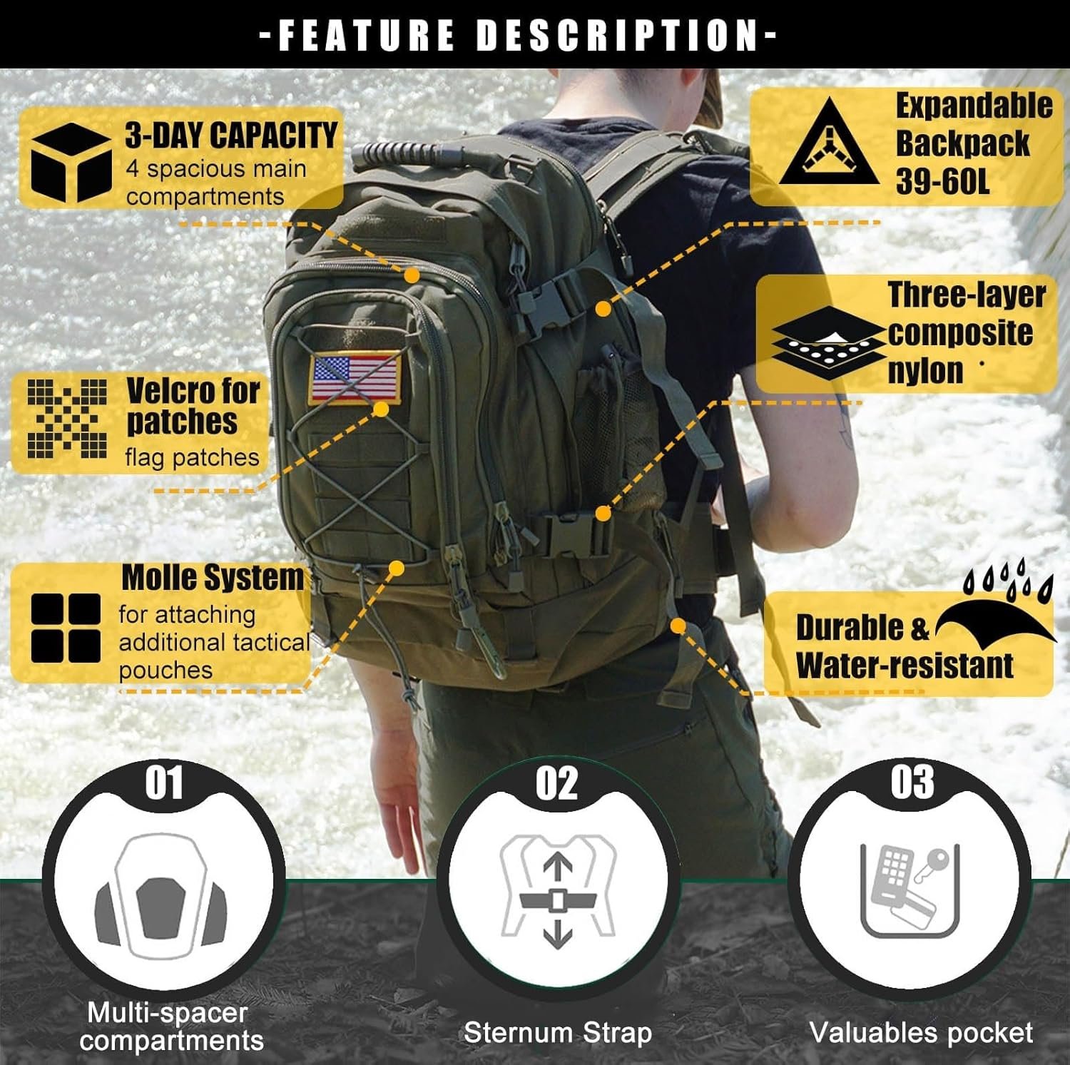 【Backpack for Travel】Military backpack has hydration compatible that works great for a hydration bladder(hydration bladder is not included) as hydration backpack. It can be used as 3 day assault pack, gym backpack, bug out bag backpack, range bag, survival backpack, army backpack, molle backpack,men backpack, hunting backpack,outdoor camping backpack, travel backpack or day pack for daily Use.