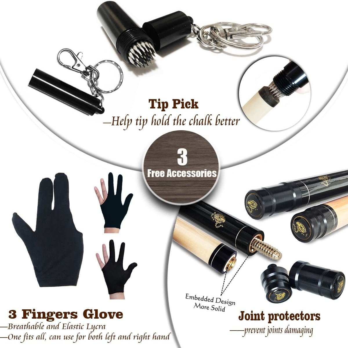 【Brass Joints】— Enhanced Play: Good corrosion resistance and anti vibration Technology makes gaming easier for you. Easily connect or disconnect into two parts for better storage and carrying.【Butt】: Quality Canadian Maple Wood with Beautiful Design Overlay Decal, Coated with 9 Layers of Varnish, Protects Cue from Moisture and Warping