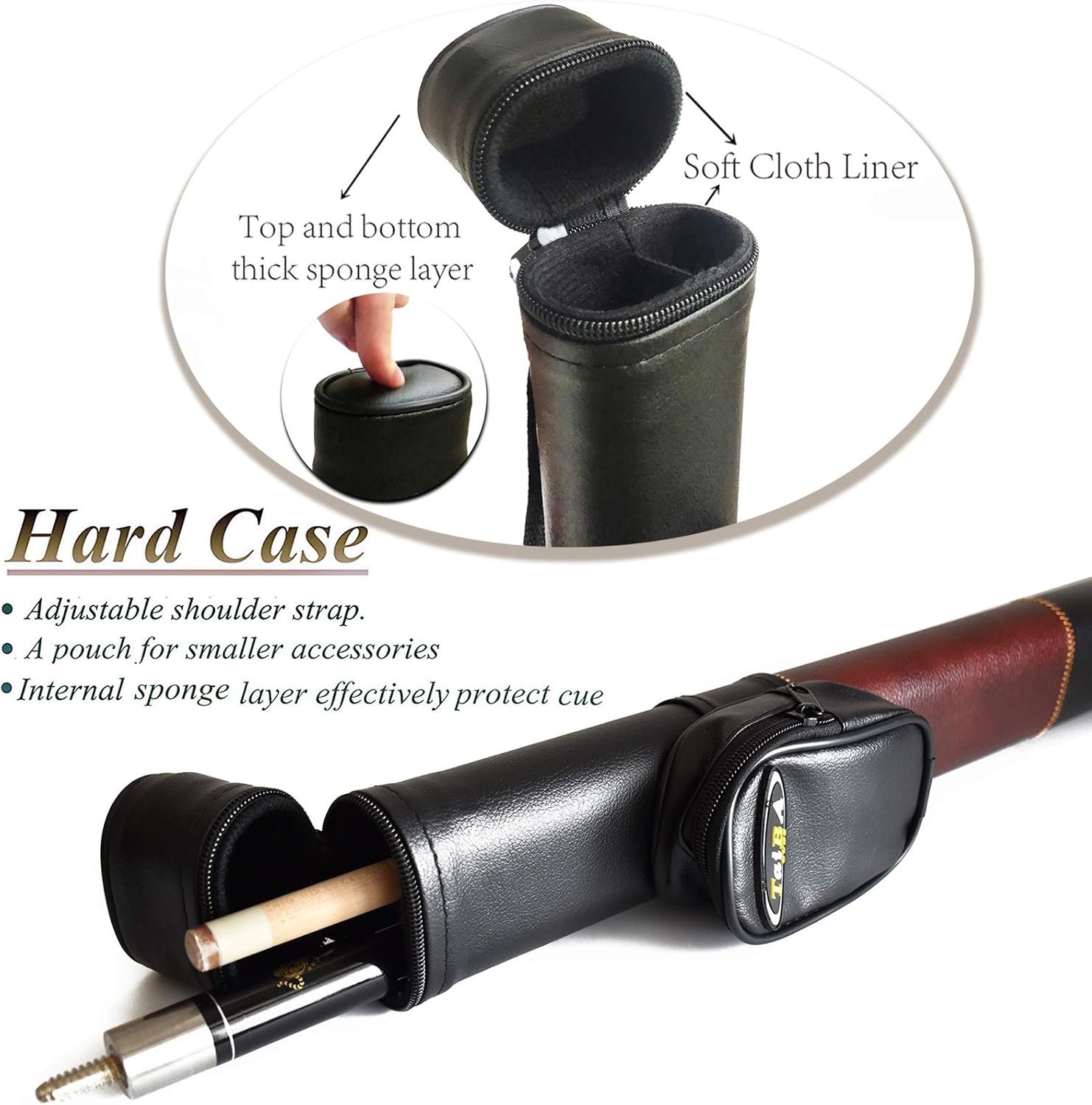 Function: Protecting your pool cue. Prevent the pool cue from warping, moisture and scratching.Material: Leather exterior (waterproof and Easy clean) + Central hard shell layer + Internal sponge layer(Effectively protect Pool Cue) + Top and bottom thick sponge (protect cue’s joint,tip and bottom better)Dimension: 32.2 X 2.75 X 1.8 ins, fits all 2-piece pool cues measuring 58 ins or lessWeights: 15.8 oz; Shoulder Strap: Adjustable, for easy portabilityA Zippered Storage Pouch: For your smaller accessories
