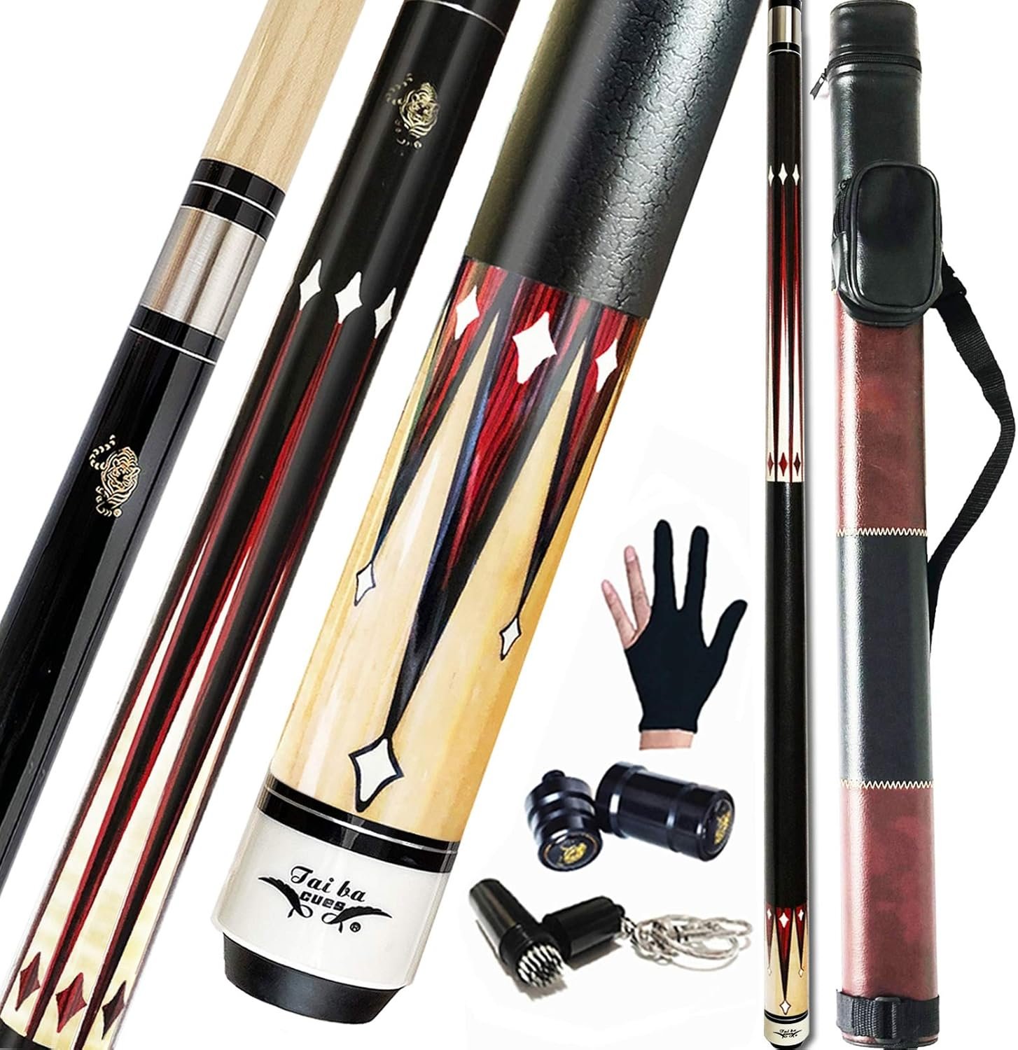 Length 58″ (standard length) Weights 18/19/20/21/22 oz (Selectable) Tip 13mm Multi-layer Leather Tip, shaped and well pre-scuffed, you can use it as soon as you get it. Shaft 100% Grade A, Hand-Selected Quality Hard Canadian Maple Wood, with extremely high compressive strength,it is easy to maintain and suitable for fast ball speed and more delicate control. Wrap Imitation leather texture grip, comfortable and provides proper friction to prevents slipping, reduces deflection, increase power and accuracy. Easy to clean. After long use won’t unravel or fluff like linen wrap. Joints Brass joints have good corrosion resistance and anti vibration Technology makes gaming easier for you. Easily connect or disconnect into two parts for better storage and carrying. With joint protectors to prevent thread damaging. Butt Canadian Maple Wood with beautiful design overlay decal butt, coated with 9 layers of varnish; The choice of wood has a great impact on the performance and feeling. Rubber Bumper Protects the cue and prevent the pool cue from hitting the ground. Multi-weight System Open the bottom rubber bumper, you can replace the weight bolt, adjust the weight of your own preference.(Other Weight bolt need to be purchased separately)