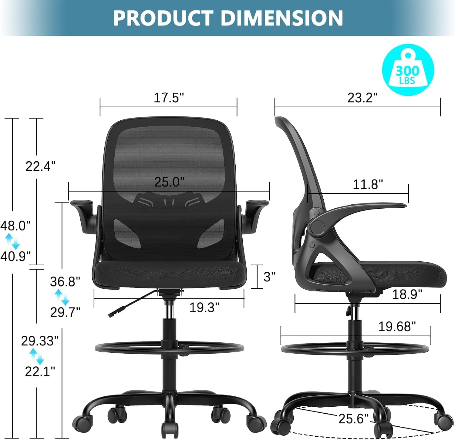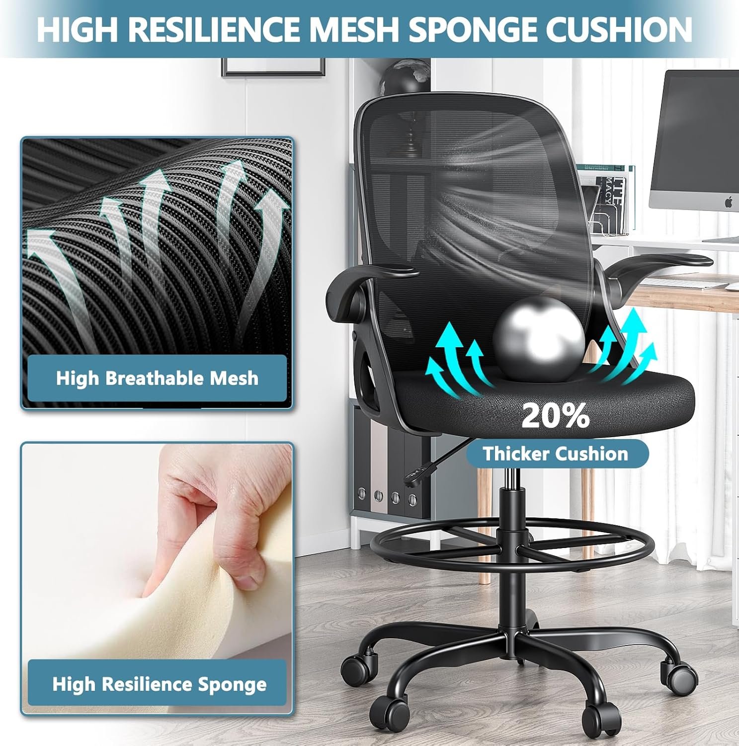 Multi Function Application: Kensaker features 90°flip-up armrest, supportive tilt lock function, 360°rotation and solid casters for smooth movement. This tall office drafting chair has a round foot ring, which can help you move your feet more frequently