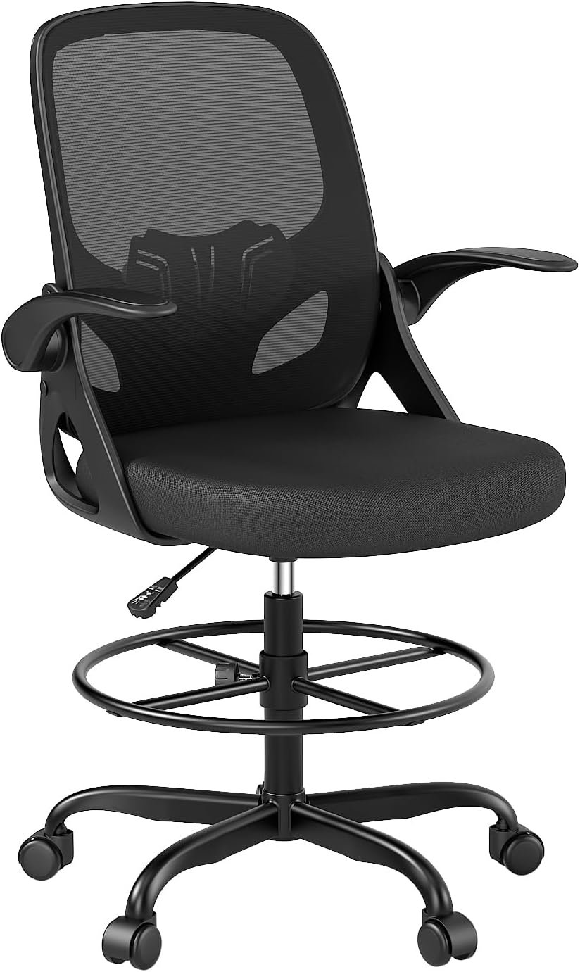 Tall Drafting Chair with Footrest Ring for Home and Work, Ergonomic Home Desk Office Chair with Flip up Arms and Lumbar Support, Extended Height Executive Desk Office(Black)