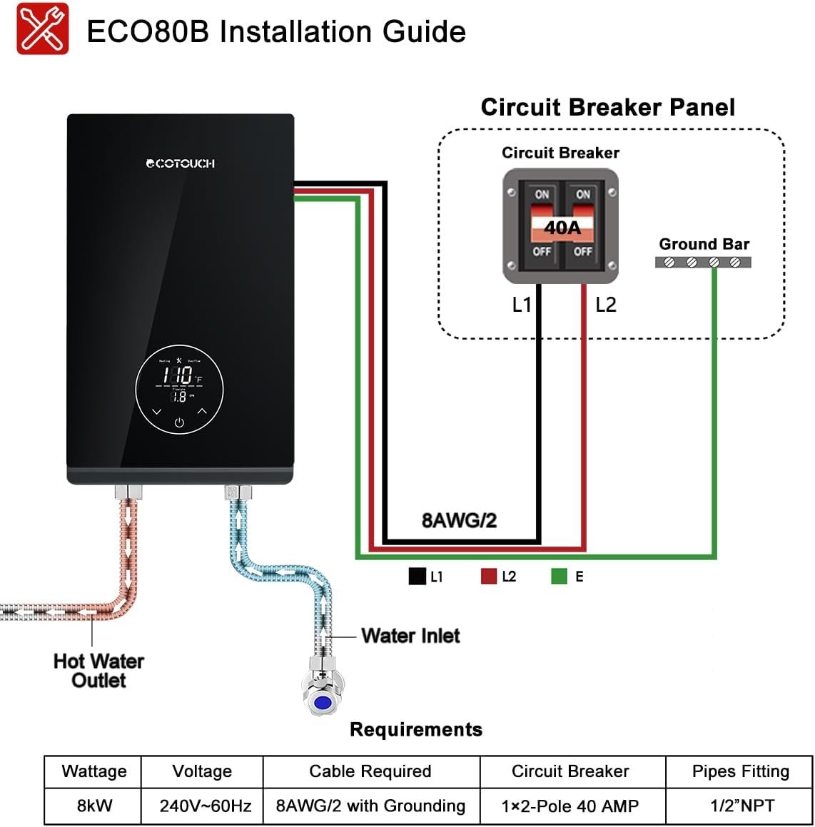 【POINT of USE WATER HEATER】The sleek electric tankless hot on demad water heater ECO80B is compact as shoes box, making it possible to install anywhere point of use to avoid waste, ideal for bathroom, kitchen, bar, school,office and hair salon. Please verify it is the right size for you: 8kW at 240V(only); dimensions: 8.04″ (W) x 13.67″ (H) x 2.55″ (D); plumbing connections :1/2″ NPT. In order to install 8kW Electric Tankless Hot Water Heater it would requires 240 Voltage, 1X40AMP Double Pole Breaker and 1X8AWG/2 wires with Grounding.