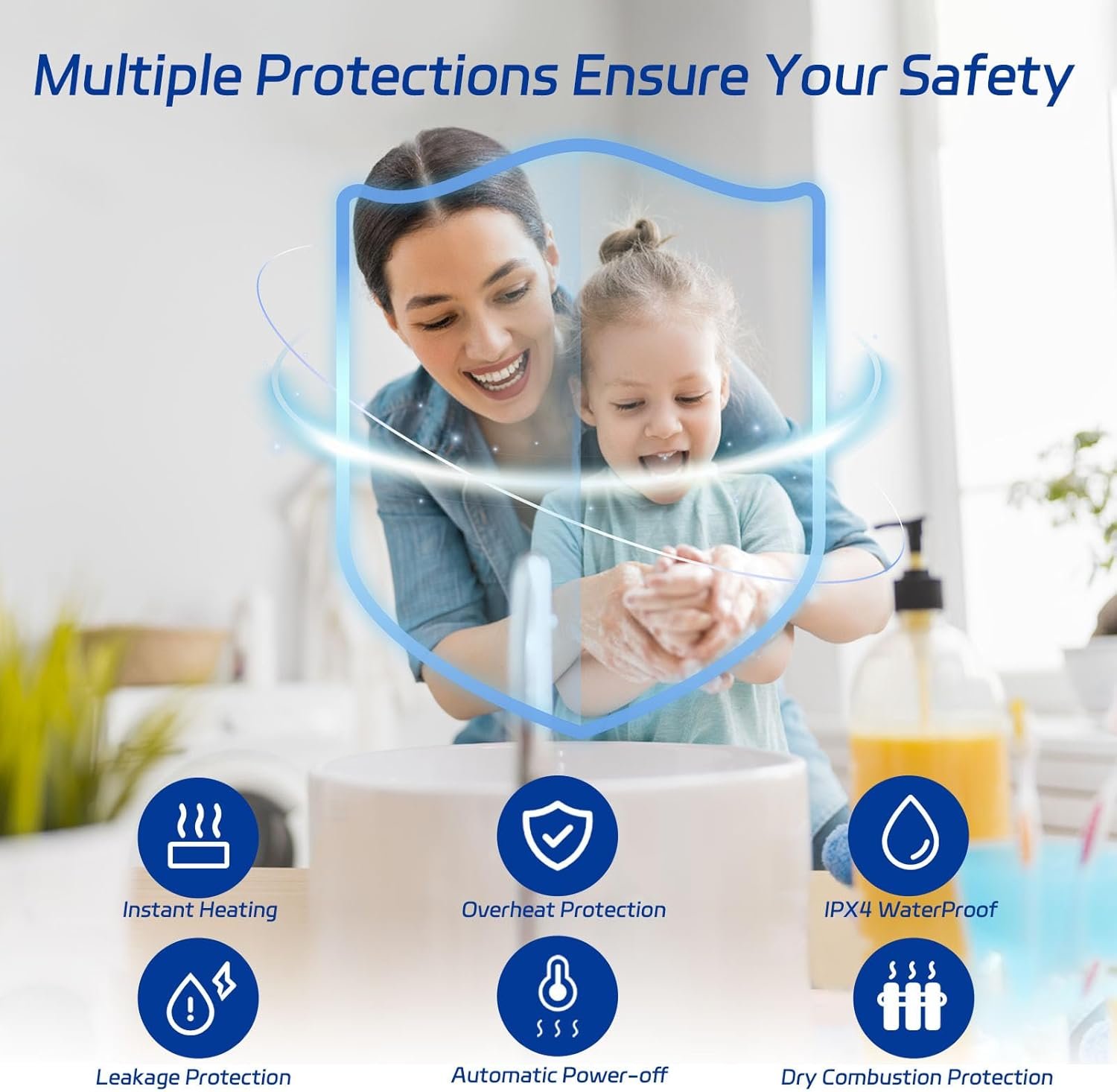 ✔ SAFETY INTELLIGENCE RELIABLE – This under sink hot water heater has multiple protection functions. Water and electricity isolation, IPX4 waterproof, leakage protection, dry boil protection, and automatic power off under overheating and inactivity. Prevent leakage and water pipe corrosion. The thermal efficiency of instant hot water heater is as high as 98%, allowing you to enjoy hot water at any time and save energy.