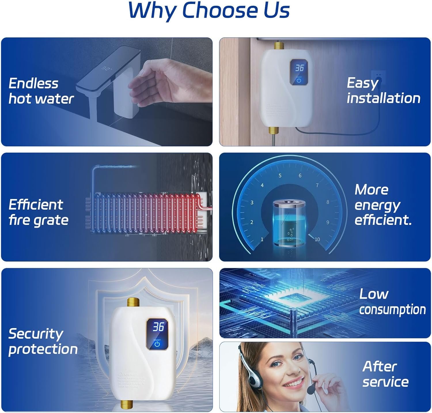 Experience the convenience and efficiency of a 3000W Tankless Water Heater. This electric mini water heater is the perfect solution for American users seeking instant hot water, space-saving design, energy-saving, and convenience.