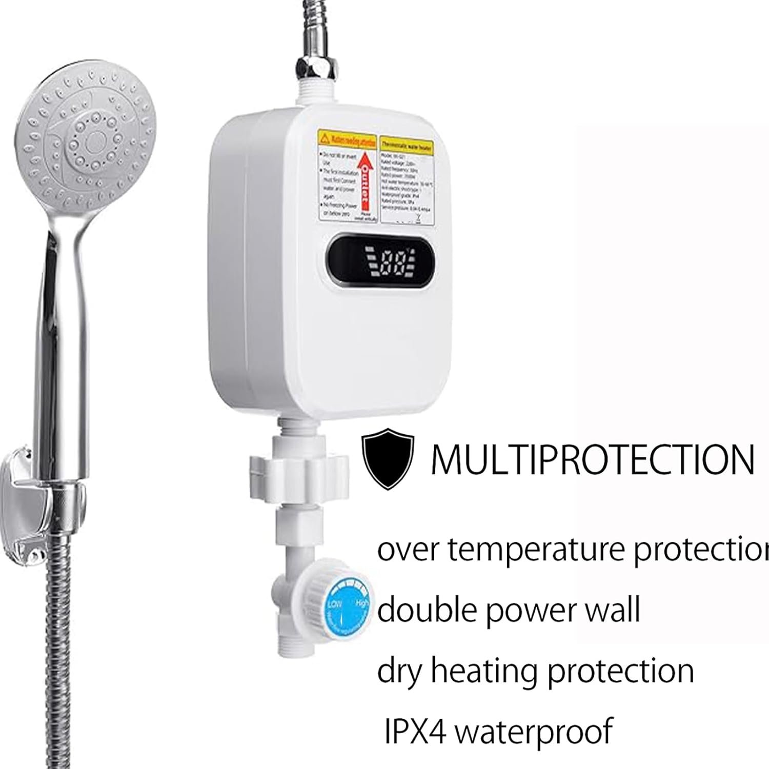 This tankless water heater is equipped with features such as over-temperature protection, double power wall, dry heating protection, and an IPX4 waterproof rating