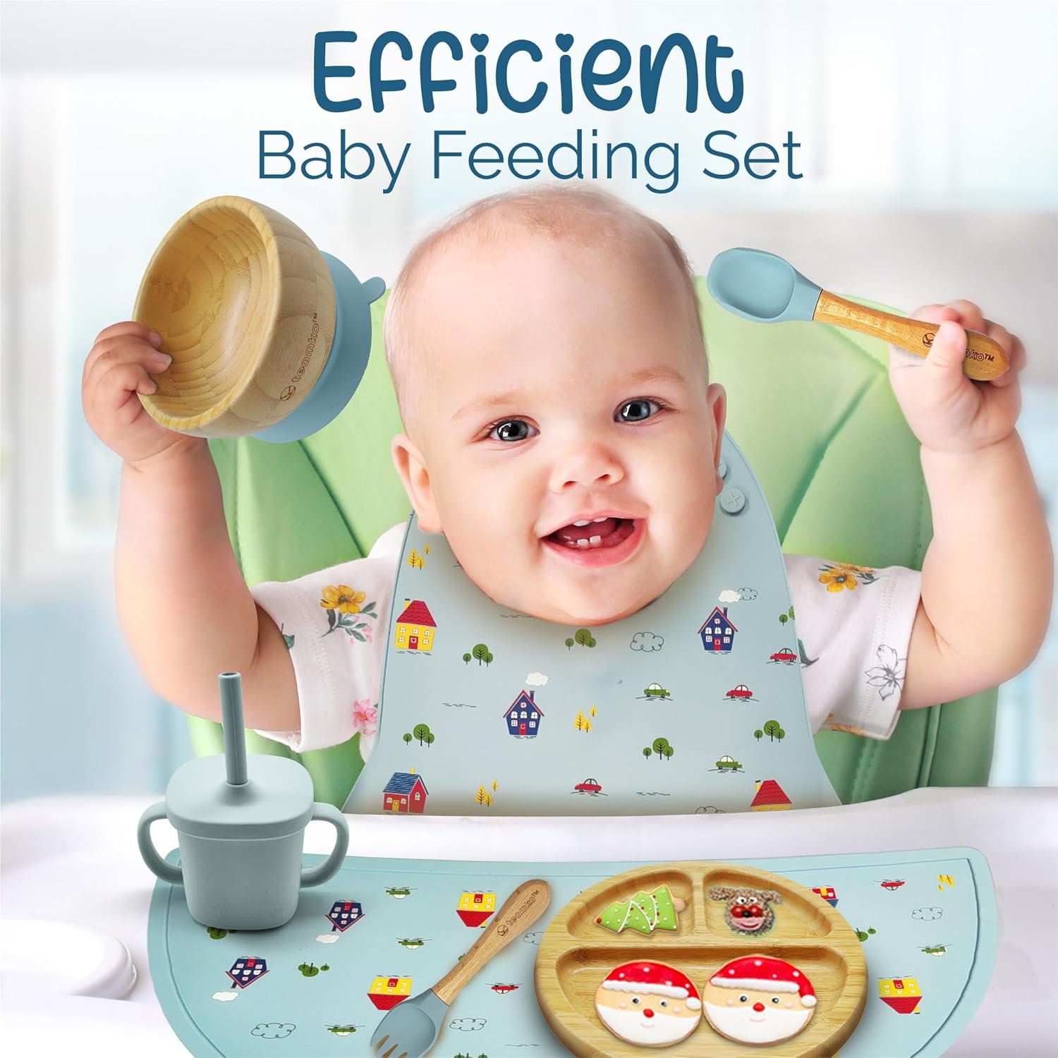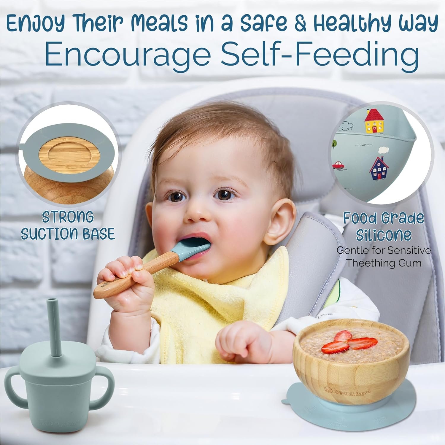 TEAMKO® Silicone Baby Feeding Set: Bamboo Baby Plate and Bowl, Bib, Utensils, Cup & Placemat – Bamboo Kids Plates – Ideal for Baby Led Weaning + Nutritional Guide