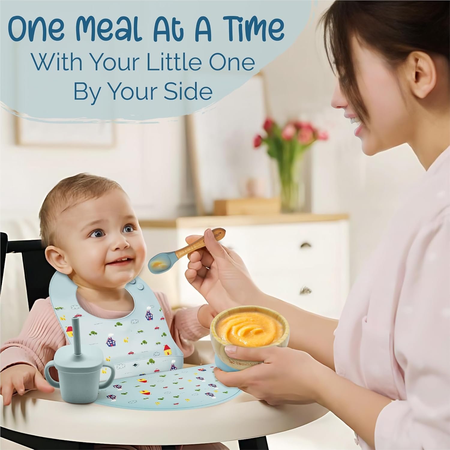 🌎 ECO-FRIENDLY CHOICE – Made from sustainable silicone and bamboo, this baby feeding essentials set is safe for your baby and the planet. Choose quality and eco-responsibility for your baby.