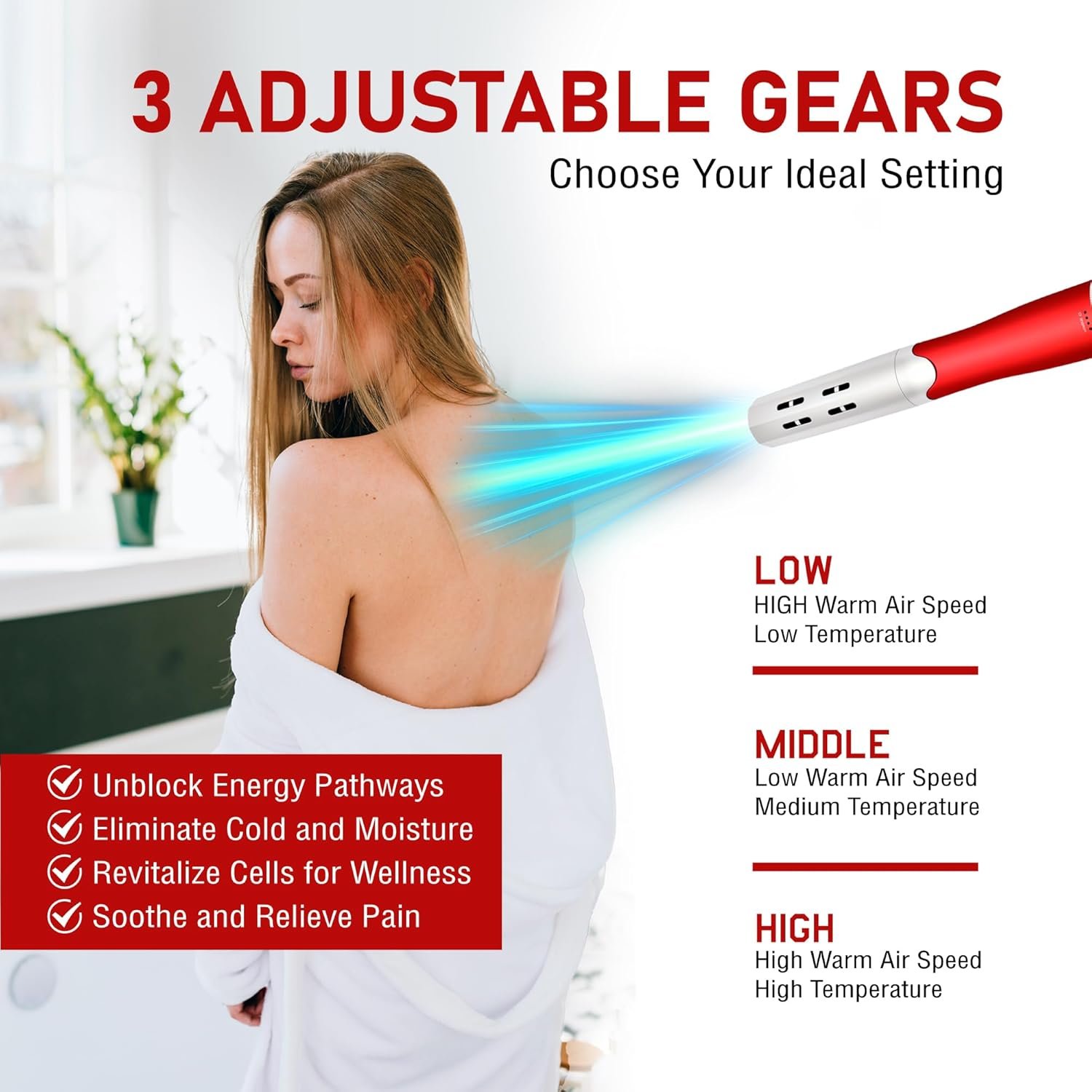 Effortlessly customize your experience with our Third Gear Mode feature, allowing you to switch between Low, Medium, and High settings with ease. Whether you need a quick blast of cool air or a soothing, warm breeze, this versatile design adapts to your needs. Enjoy high wind speed with low temperatures on the Low setting, medium warmth on the Middle setting, or powerful heat and airflow on High. Tailor your comfort for any situation, all at the turn of a dial.