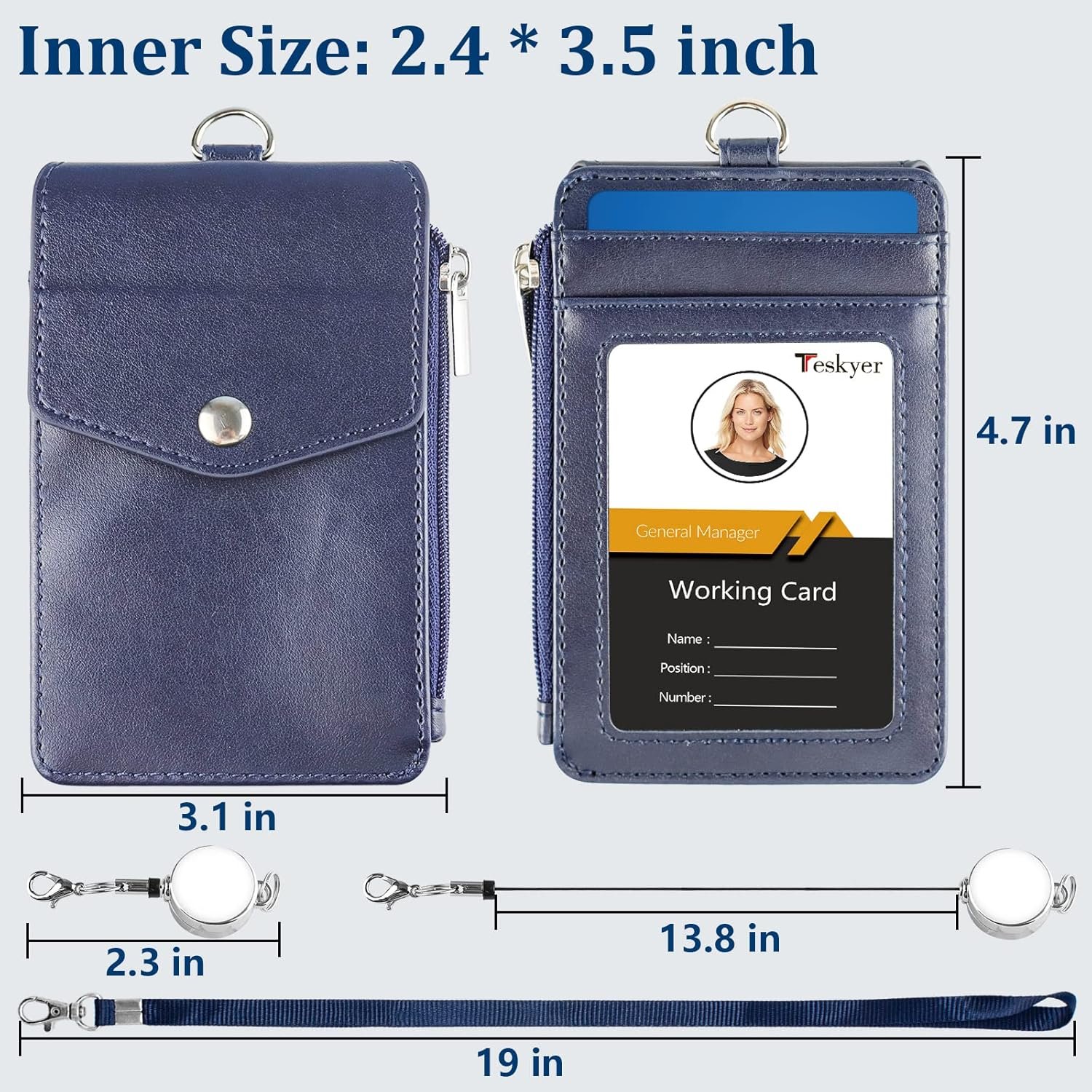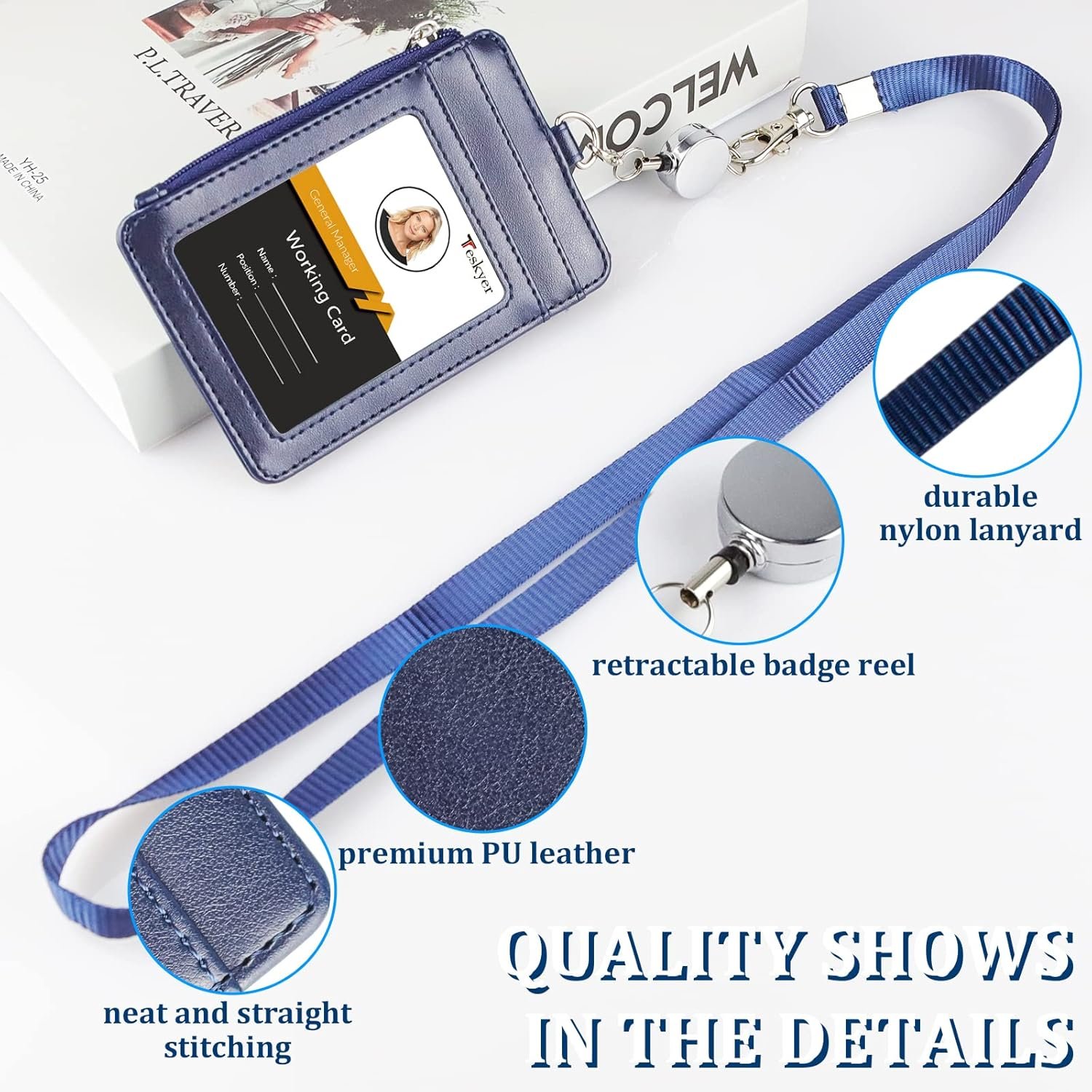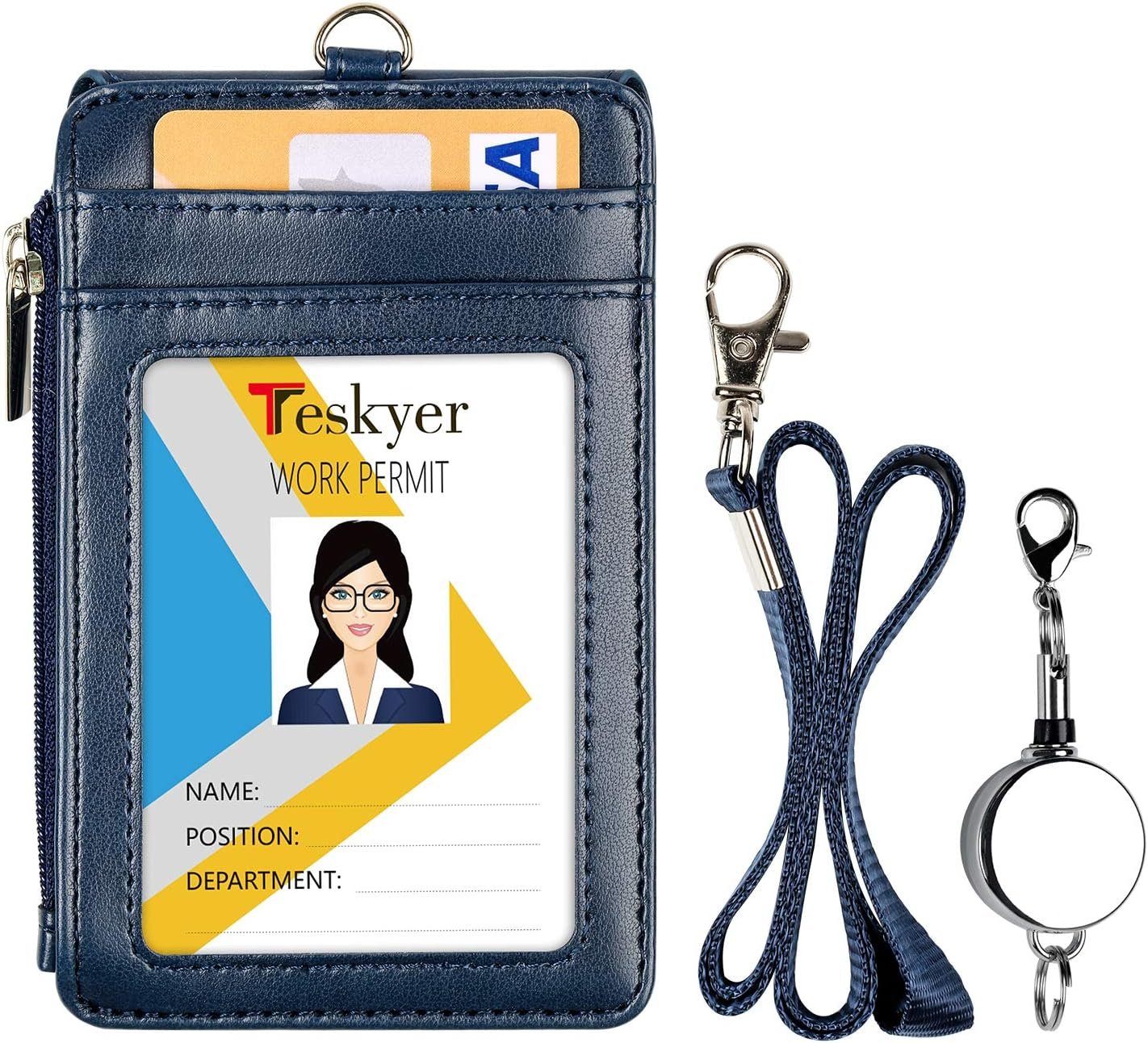 Teskyer Leather Badge Holder with Lanyard and Retractable Badge Reel, 4 Card Slots ID Card Holder with 1 Zipper Pocket for Office School Name Work IDs, Blue