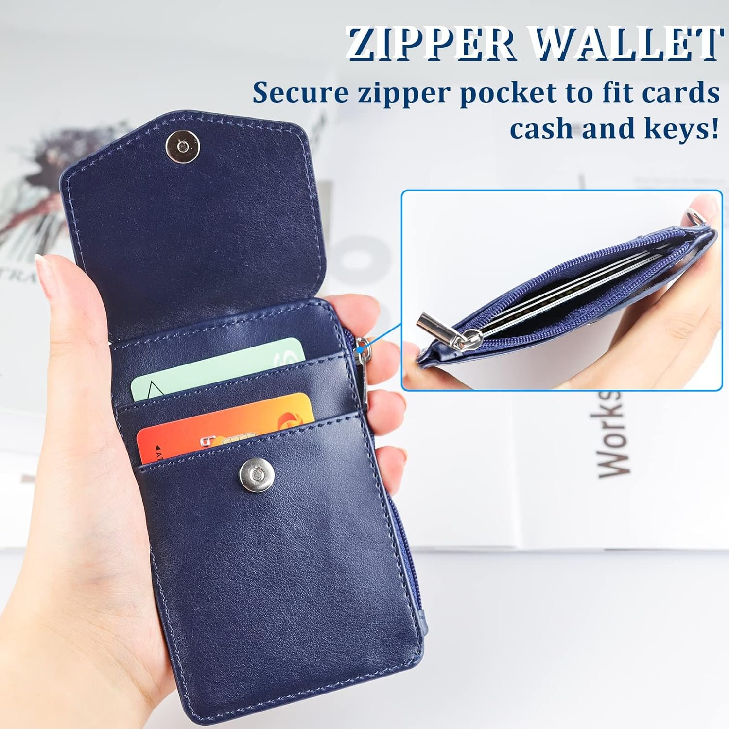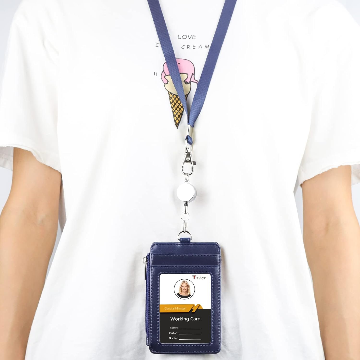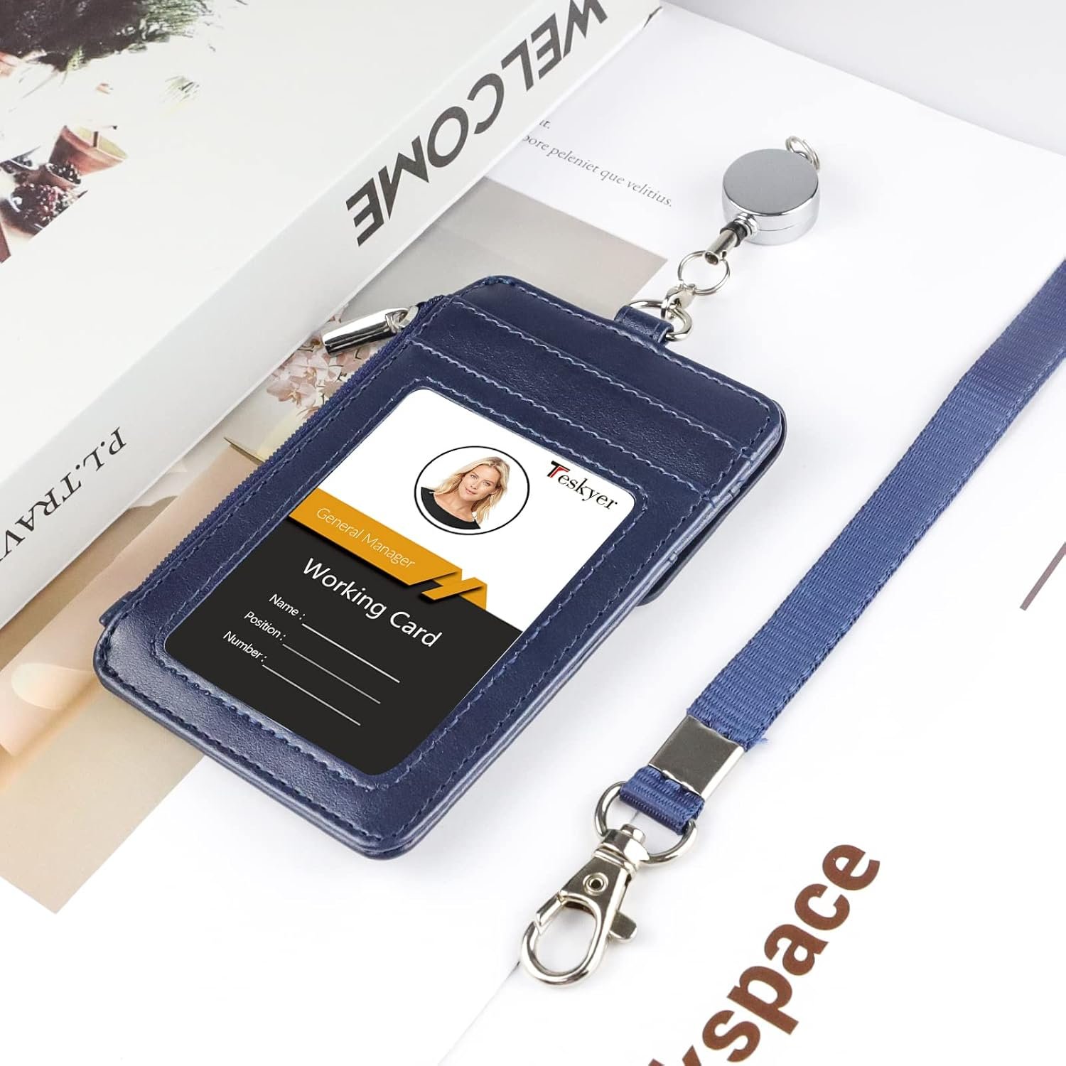 Teskyer Leather Badge Holder with Lanyard and Retractable Badge Reel, 4 Card Slots ID Card Holder with 1 Zipper Pocket for Office School Name Work IDs, Blue