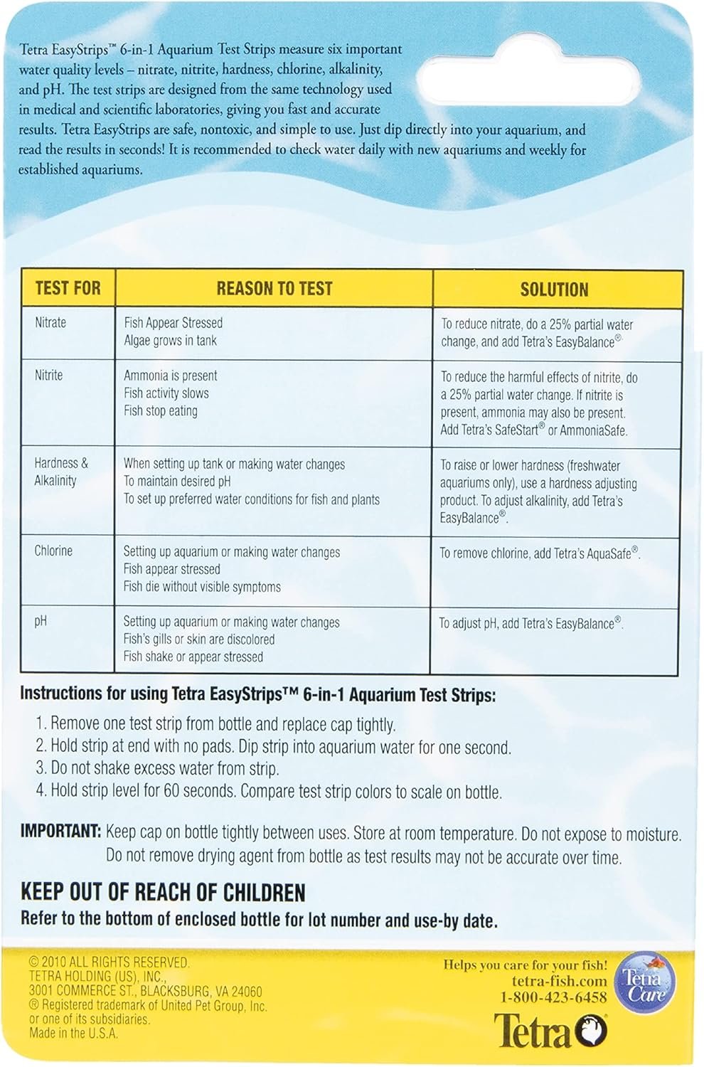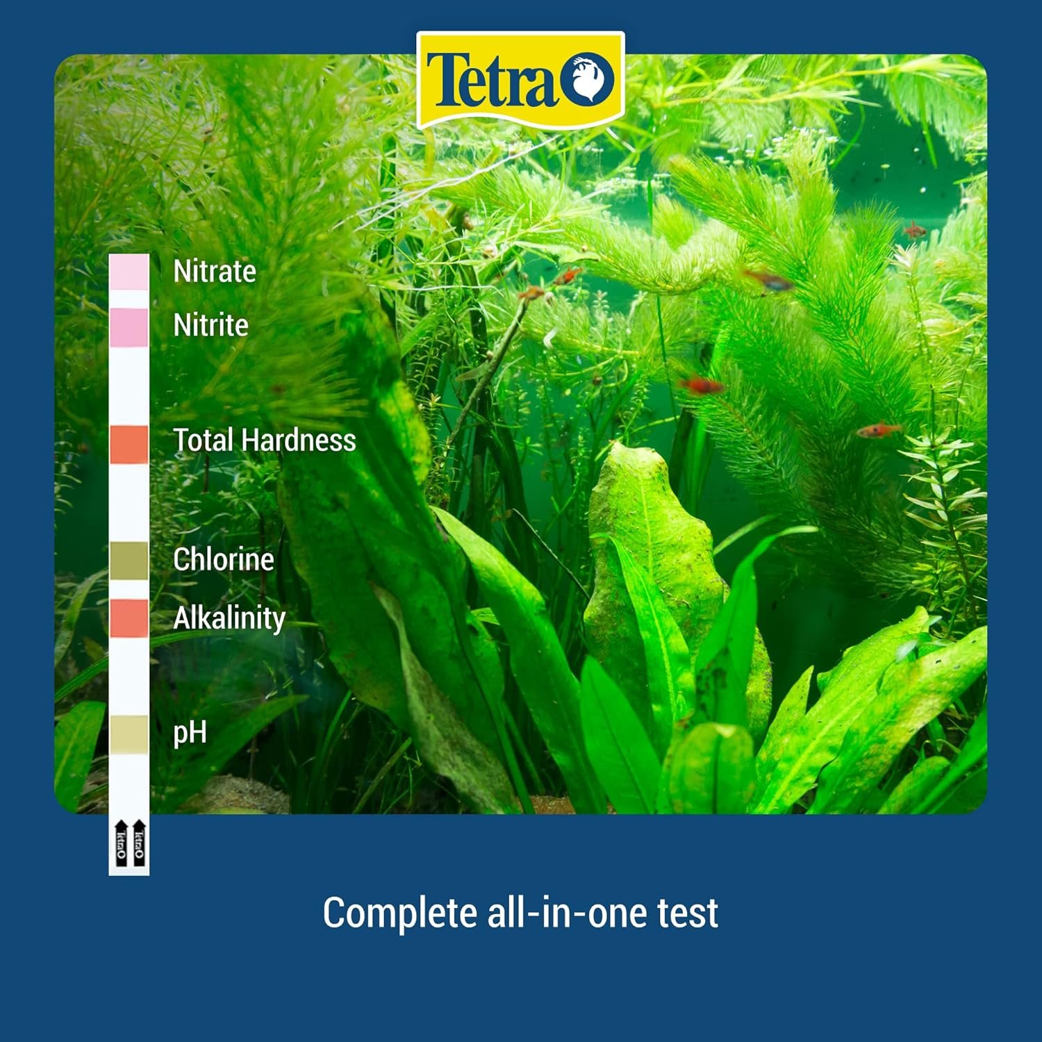 Maintaining a healthy, safe aquarium environment for your fish is important, and regularly testing your water levels is critical to success. Tetra® EasyStrips™ Test Strips are the perfect solution. By quickly testing for all water-quality issues in your aquarium water, these strips provide accurate results with minimal effort, using the most advanced technology in water testing. Many factors can affect the water in your aquarium – including the source of your water (municipal vs. spring water), the food you feed your fish, the amount of algae growing and much more. Tetra EasyStrips are accurate, fast and easy to use. Just dip quickly in your aquarium water, wait 60 seconds and get readings on chlorine, alkalinity, nitrite, water hardness, nitrate and pH level for complete, all-in-one testing. Use the color chart (included) to interpret your test results and determine how best to manage your aquarium’s water quality. Use weekly in both freshwater and saltwater tanks. Since 1951 Tetra has developed the world’s most comprehensive body of fish food knowledge, and fishkeeping enthusiasts have looked to the brand for products and solutions that add ease and beauty to their home. Whether you’re an experienced hobbyist or just starting out, Tetra has everything you need–-from a large variety of quality fish food and innovative equipment to test kits and decor.