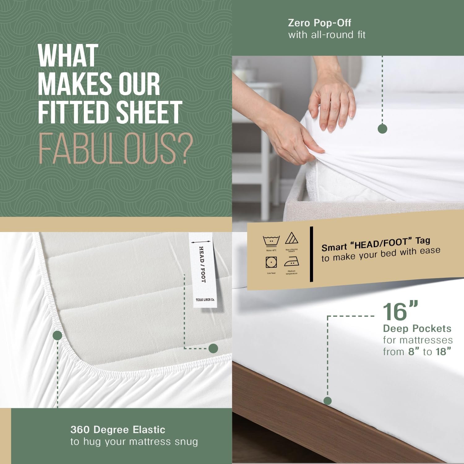 Includes A Complete & Well-Fitting 4 Piece Sheet Set: The organic sheets king set include 1 top or flat sheet (108” x 102”), 1 fitted or bottom sheet (78” x 80” + 16”), and 2 king pillow cases (21” x 40”). Elasticized fitted bedsheet has extra deep pockets to fit all kinds of mattress. Head / foot indicators help you make the bed quickly. Looking for an extra pillowcase or other bedding items? Check out the Texas Linen Co.’s bed room collection