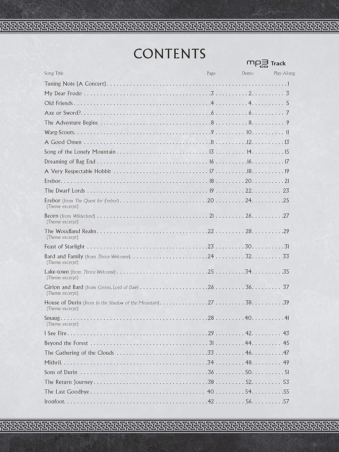 Instrumentalists will delight in this collection, which features thematic interpretations of 28 selections from Howard Shore’s brilliant scores to The Hobbit motion picture trilogy. Shore masterfully expands upon the musical palette of Middle-earth, blending familiar motifs from the Lord of the Rings trilogy with an exciting array of memorable new themes. This beautifully produced folio features an array of colorful photos from the film. Titles: My Dear Frodo * Old Friends * Axe or Sword? * The Adventure Begins * Warg-scouts * A Good Omen * Song of the Lonely Mountain * Dreaming of Bag End * A Very Respectable Hobbit * Erebor * The Dwarf Lords * Beorn * The Woodland Realm * Feast of Starlight * Bard and Family * Lake-town * Girion and Bard * House of Durin * Smaug * I See Fire * Beyond the Forest * The Gathering of the Clouds * Mithril * Sons of Durin * The Return Journey * The Last Goodbye * Ironfoot.