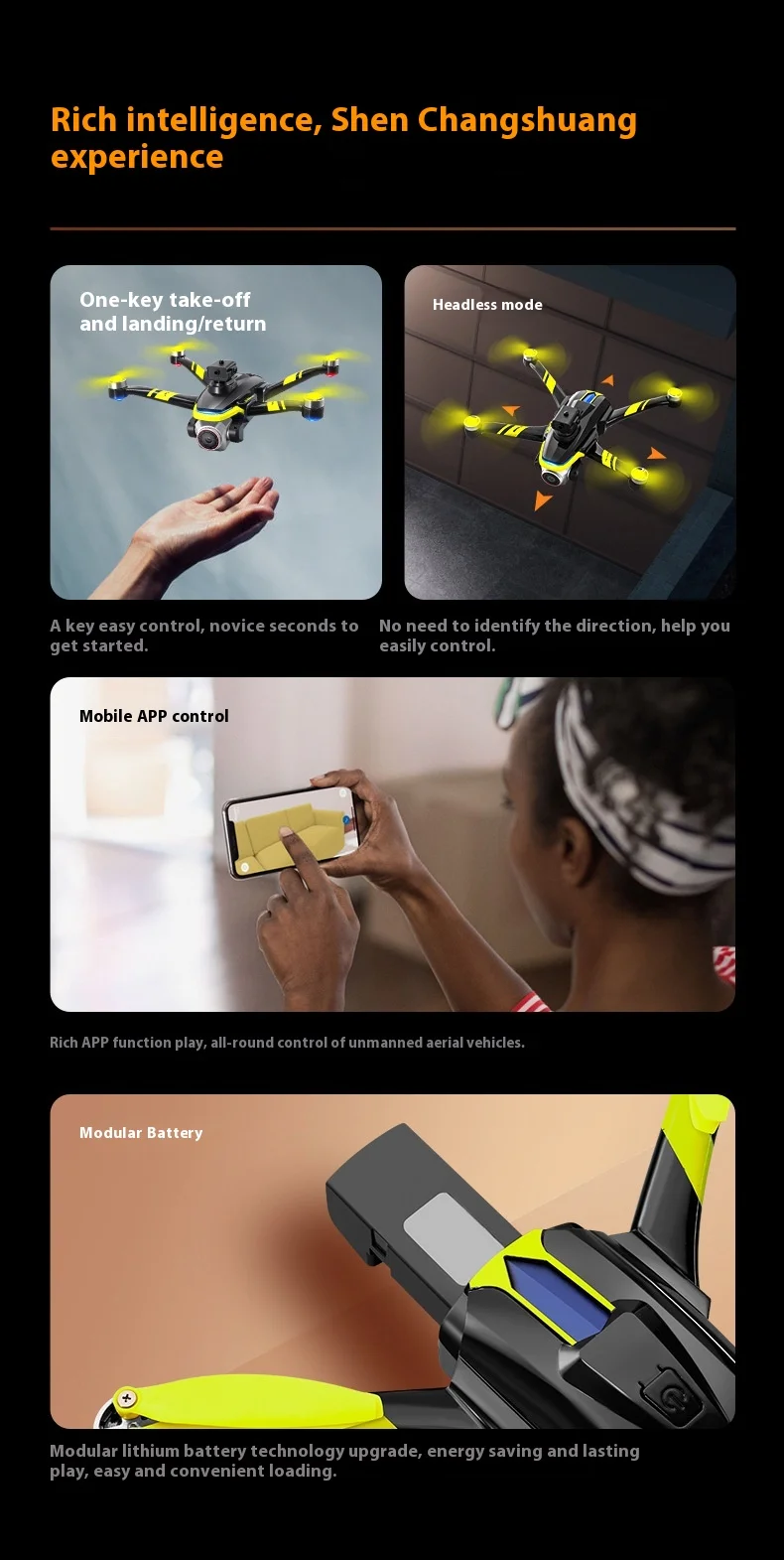 One-click panoramic shooting, intelligent following, waypoint flight, gesture control, and automatic return when battery is low