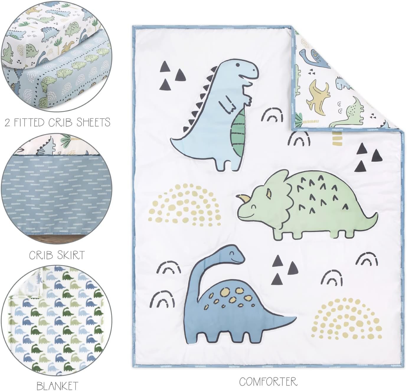 Dinosaur Theme: Bring the excitement of dinosaurs to your toddler’s or baby’s nursery with playful blue and green dinos on a beautifully designed crib quilt and baby crib sheets, combined with geometric accents for a charming touch.