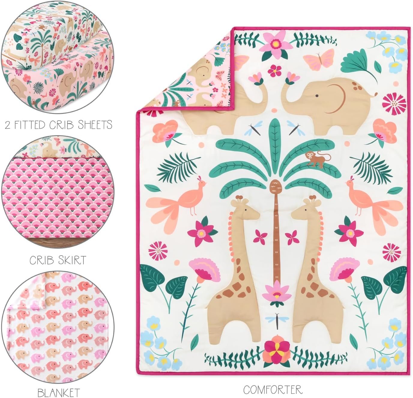 The Peanutshell 5 Piece Baby Crib Bedding Set for Girls – Newborn, Infant & Toddler Nursery Bed Set Decor with Fitted Crib Sheets, Blanket, Dust Ruffle Comforter – Bright Safari