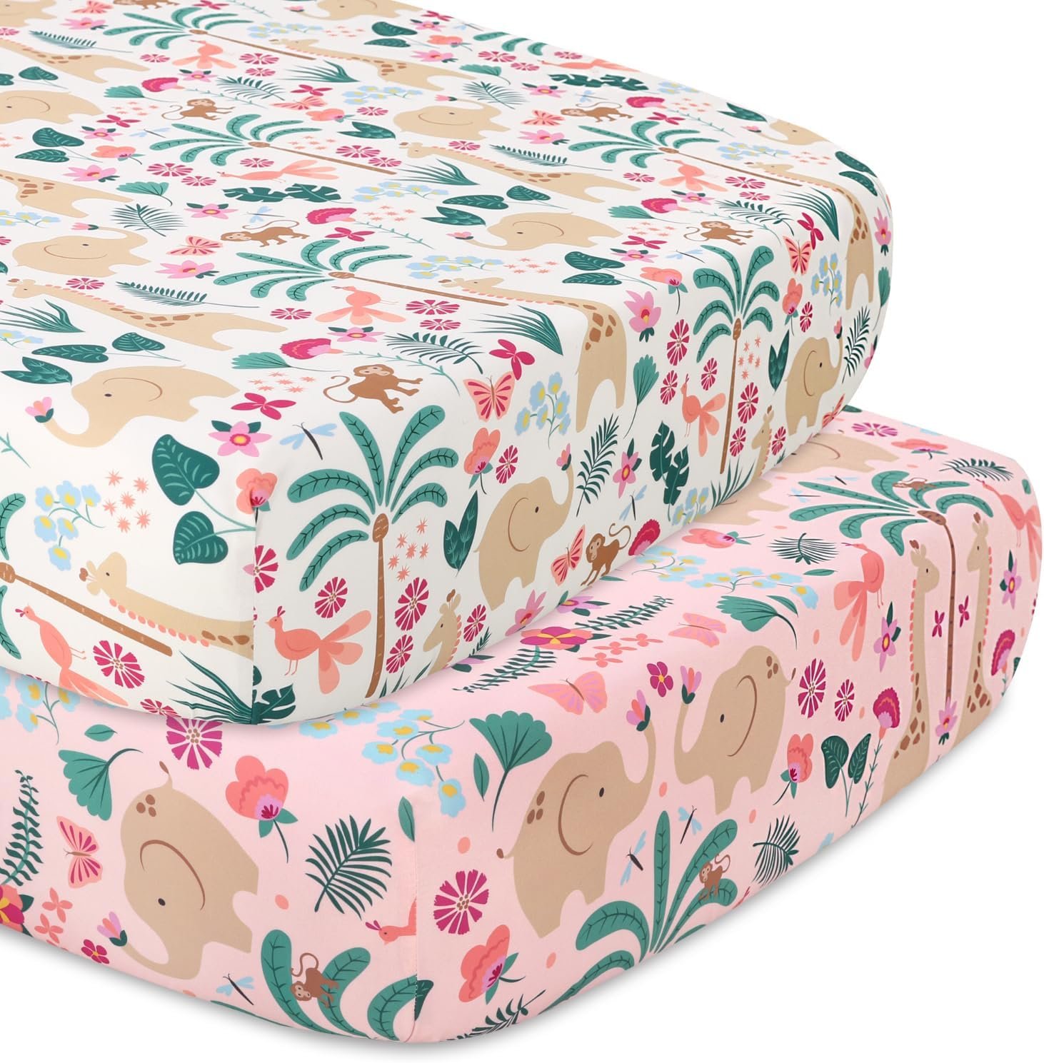 Safari Theme: Bring the excitement of safari to your toddler’s or baby’s nursery with playful elephants and giraffes on a beautifully designed crib quilt and baby crib sheets, combined with pink flowers for a charming touch.