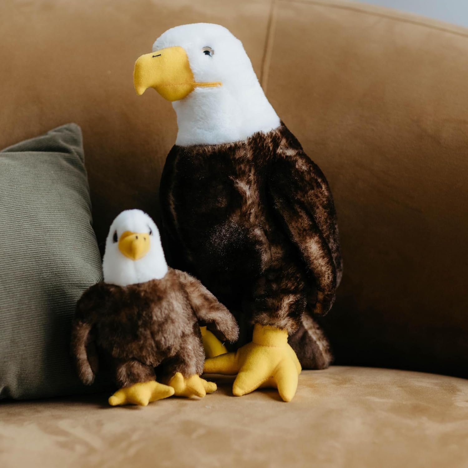 Treasure the rarity of this bald eagle plush toy that is outfitted with a yellow beak, webbed feet and a soft brown body.