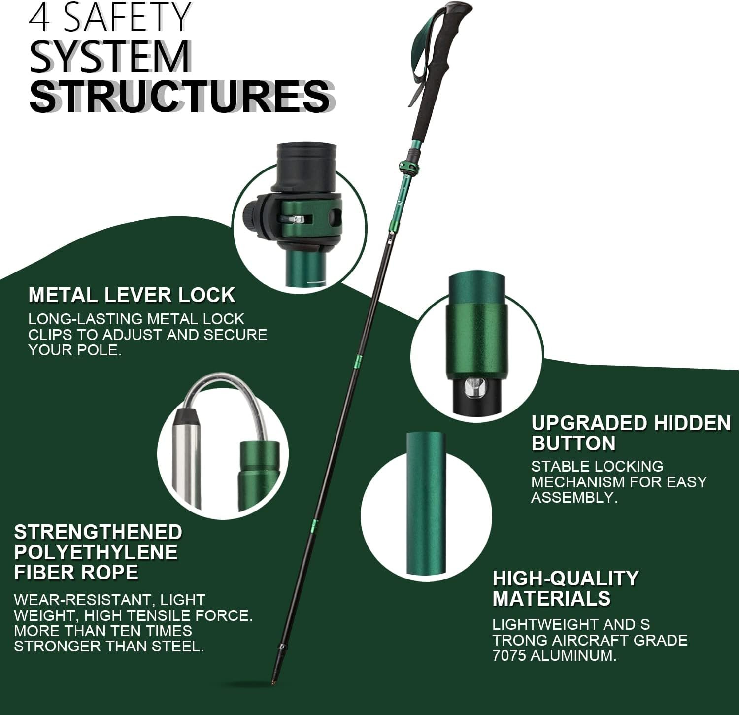 Durable and Worry-free: TheFitLife hiking poles are made of lightweight 7075 aluminum alloy which is commonly used in aviation. It withstands pressure and shock better, in addition, it helps reduce back and knee joint stress. Metal lever lock and hidden button locking mechanism make it stable and secure
