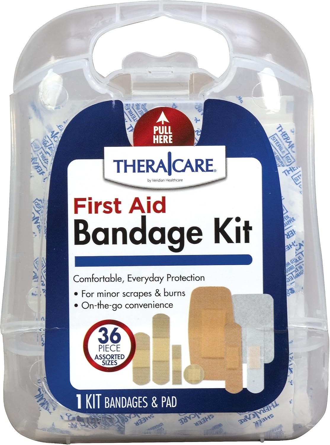 Thera|Care First Aid Bandage Kit provides Sterile bandages help to cover wounds from dirt, debris and germs to help prevent infection Sizes: 10 Sheer Small Strip Bandages (.375” x 1.25”) 8 Sheer Spot Bandages (.875” x .875”) 8 Sheer Junior Strip Bandages (.75” x 2.25”) 4 Sheer Strip Bandages (.75” x 3”) 2 Clear Strip Bandages (.75” x 3”) 2 Flexible Fabric Strip Bandages (.75” x 3”) 1 Flexible Fabric Patch Bandages (2” x 4”) 1 Non-Stick Pad (2” x 3”)
