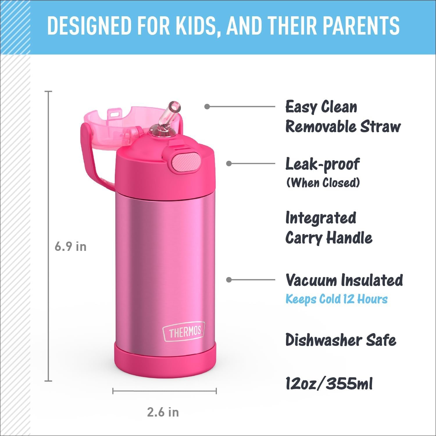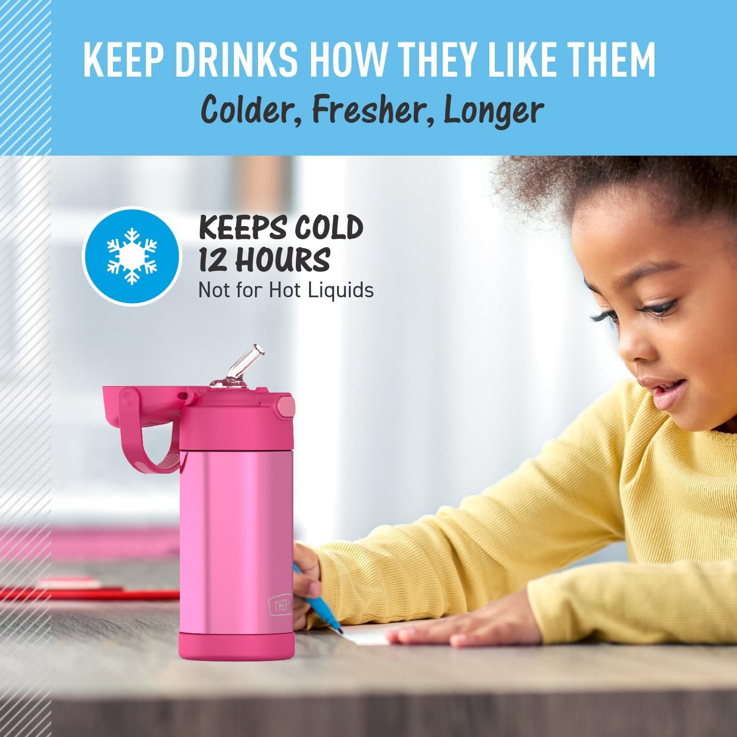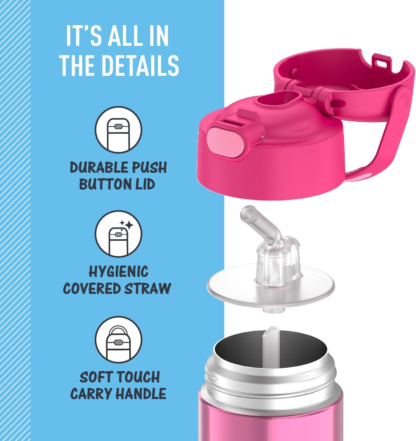 THERMOS FUNTAINER Water Bottle with Straw – 12 Ounce – Kids Stainless Steel Vacuum Insulated Water Bottle with Lid, Pink