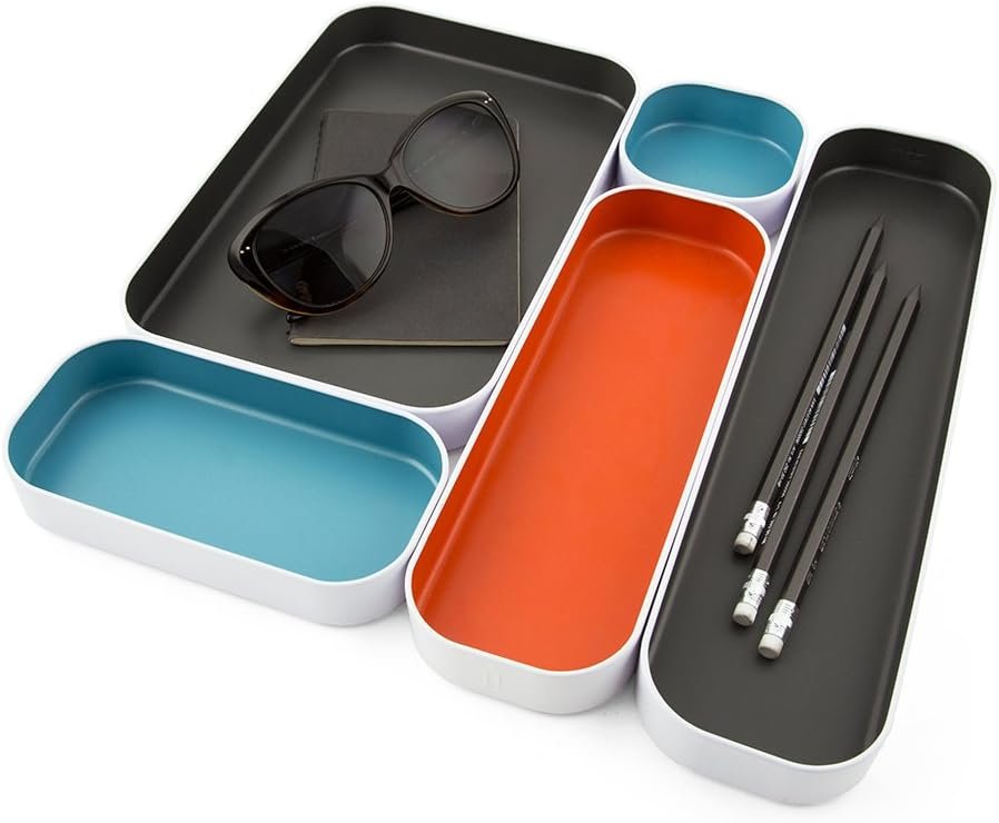Three by Three Seattle 5 Piece Metal Organizer Tray Set for Storing Makeup, Stationery, Utensils, and More in Office Desk, Kitchen and Bathroom Drawers (1 Inch, Gray, Sky Blue, Orange)