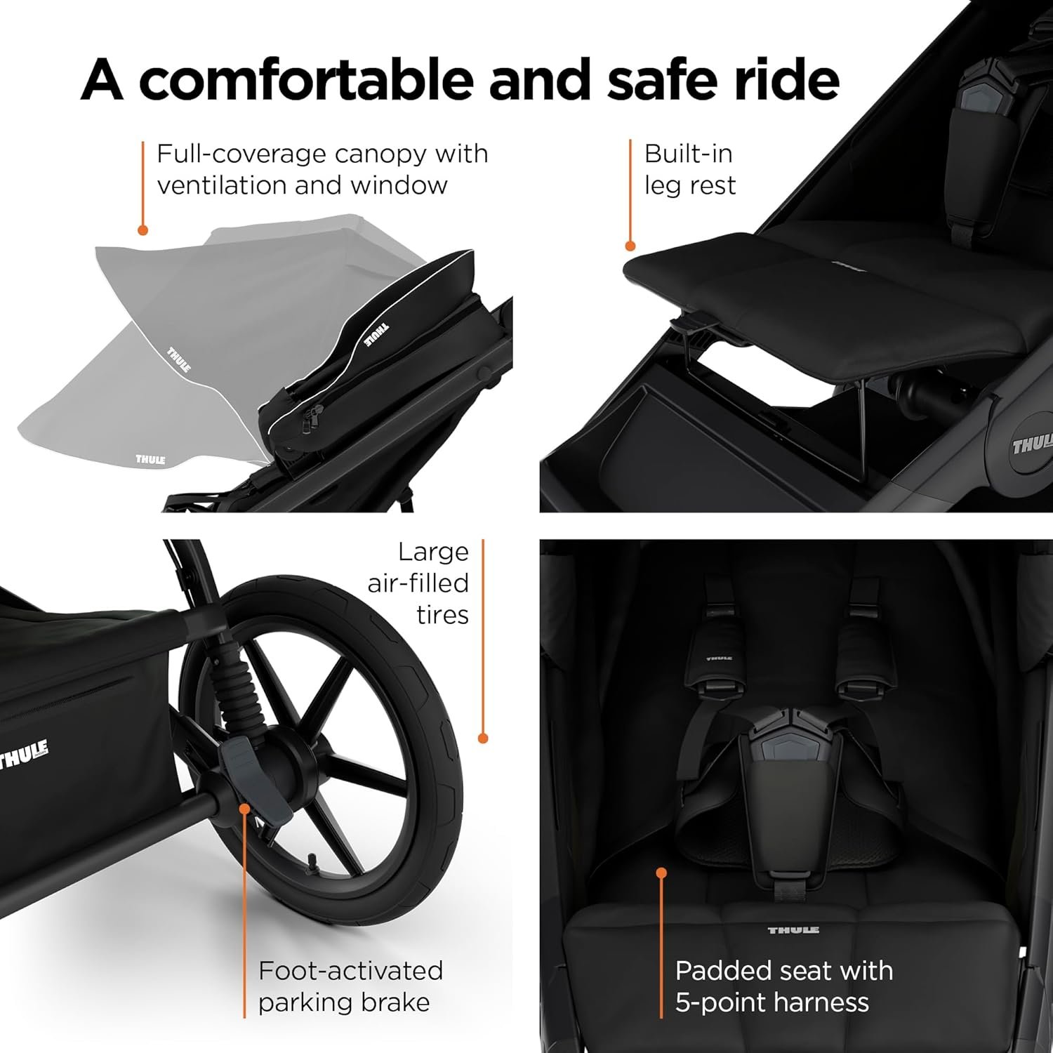Ultra-smooth ride: This Thule stroller features large 16-inch wheels with air filled tires, suspension and swivel front wheels that locks into place for jogging and running; baby stroller with hand brake for confident speed control