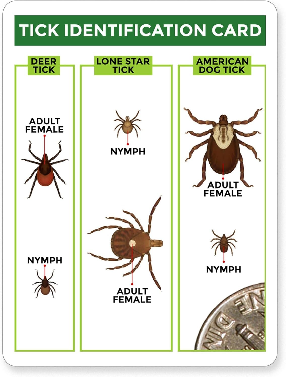 The included tick identification card will allow you to identify the three main tick species in North America, including the Deer Tick, the causative agent of Lyme disease.