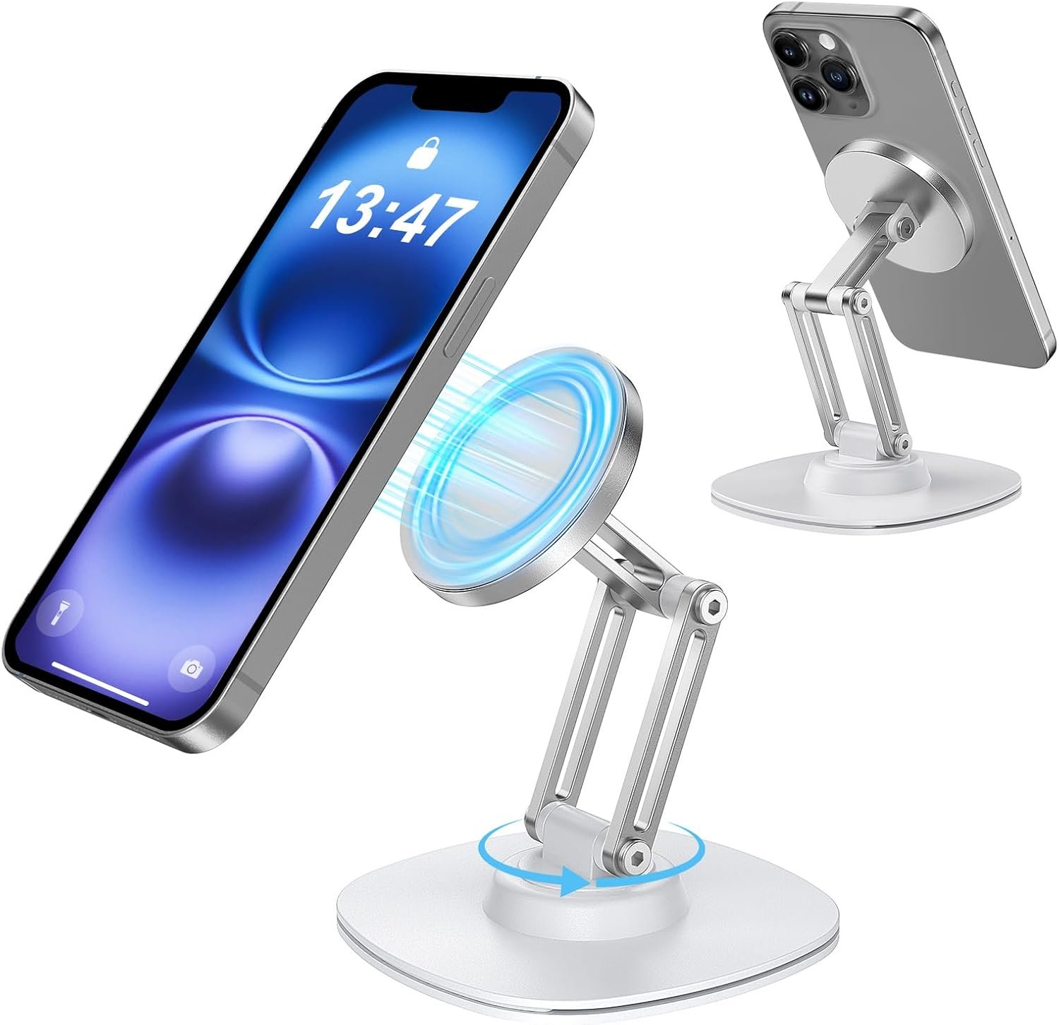 TIGRIS 360° Rotating Magnetic Phone Stand for Desk, Adjustable Foldable & Portable Aluminum Stand with Angle Adjustment Cell Phone Holder, Compatible with MagSafe iPhone 17/16/15/14/13/12 Air Pro Max