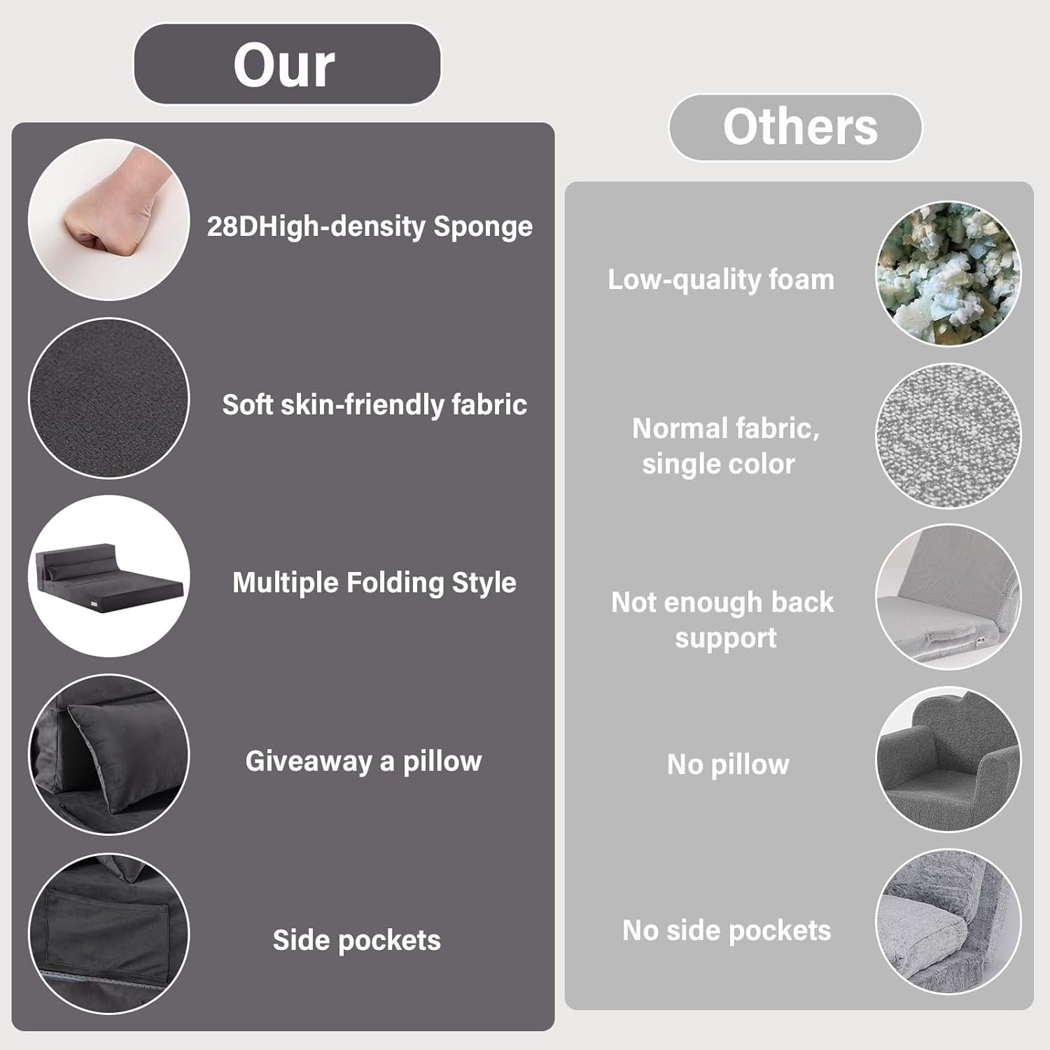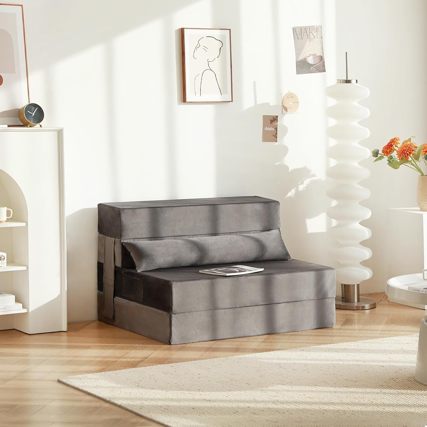 Giveaway A Bed Pillow: Compared to the common 90 degrees pull out couch backrest found in the market, the bed pillow reduces pressure on the back and enhances relaxation, versatile enough for both decorative purposes on a folding mattress sofa and as a comfortable sleep accessory for a floor mat. For outdoor adventures like picnics, camping, or traveling, this lightweight and portable mattress effortlessly fits into your car’s trunk for on-the-go comfort