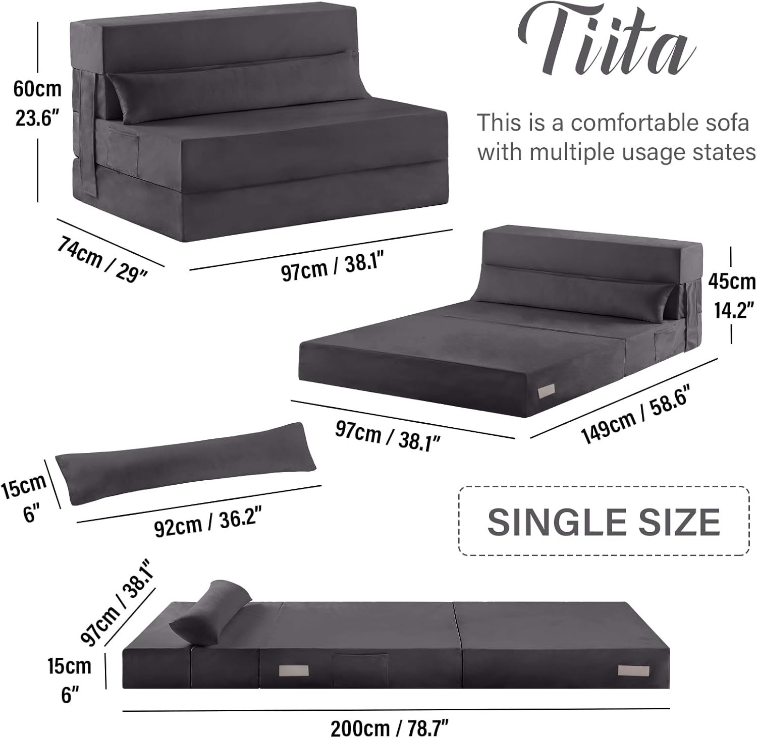 Foldable Chair Bed Size: 78.5″D x 27″W x 5″H – Single. 78.7″D x 38.1″W x 6″H – Twin. The Folding Sofa Bed Mattress for Adults offers versatile configurations, serving as a floor bed, lounge chair, or play couch to meet various needs.