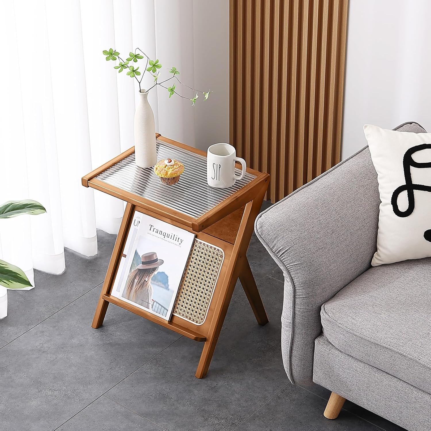 【End Table High-Quality Material】This end table is made of corrugated glass and natural handmade rattan bamboo, high-quality eco-friendly. Rattan is a natural and renewable material that ages beautifully and develops its own unique character over time. Eco-friendly coating keeps the nightstand looking artistic for long time use and easy to clean.